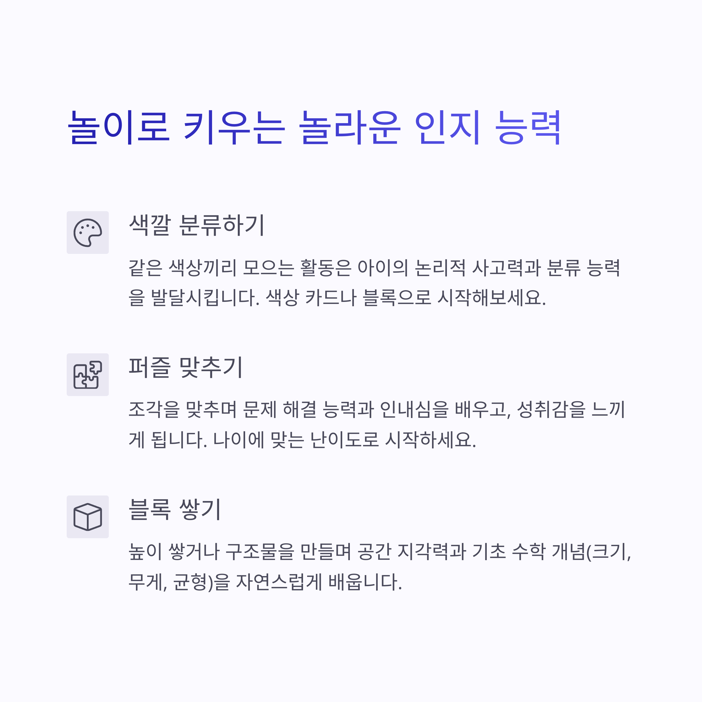 놀이는 단순한 시간이 아니라, 배움의 가장 자연스러운 방식이에요. 아이는 놀면서 보고, 듣고, 느끼고, 연결합니다. 오늘 하나의 놀이를 ‘학습의 눈’으로 바라보면, 아이의 발달이 달라져요. 공부보다 먼저, 재미와 연결부터 시작해보세요.