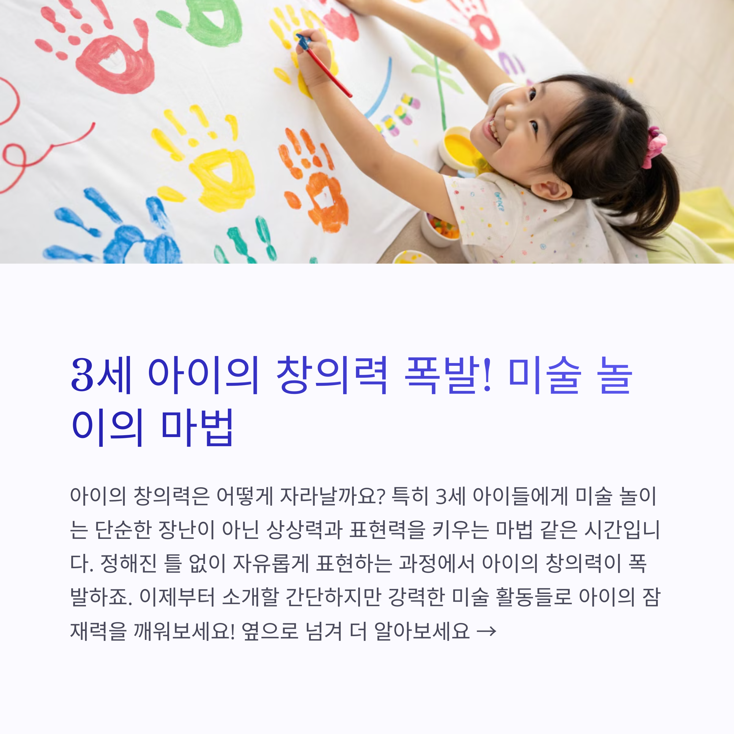 3세 아이는 손으로 느끼고, 색으로 상상하며 사고를 넓혀가는 시기입니다. 미술 놀이는 단순히 그림을 그리는 활동이 아니라, 감정 표현, 소근육 발달, 창의적 사고까지 자극하는 종합 발달 툴이에요. 무엇보다 정답이 없는 놀이라 아이가 ‘마음껏 시도해볼 수 있다’는 점이 가장 큰 매력입니다.