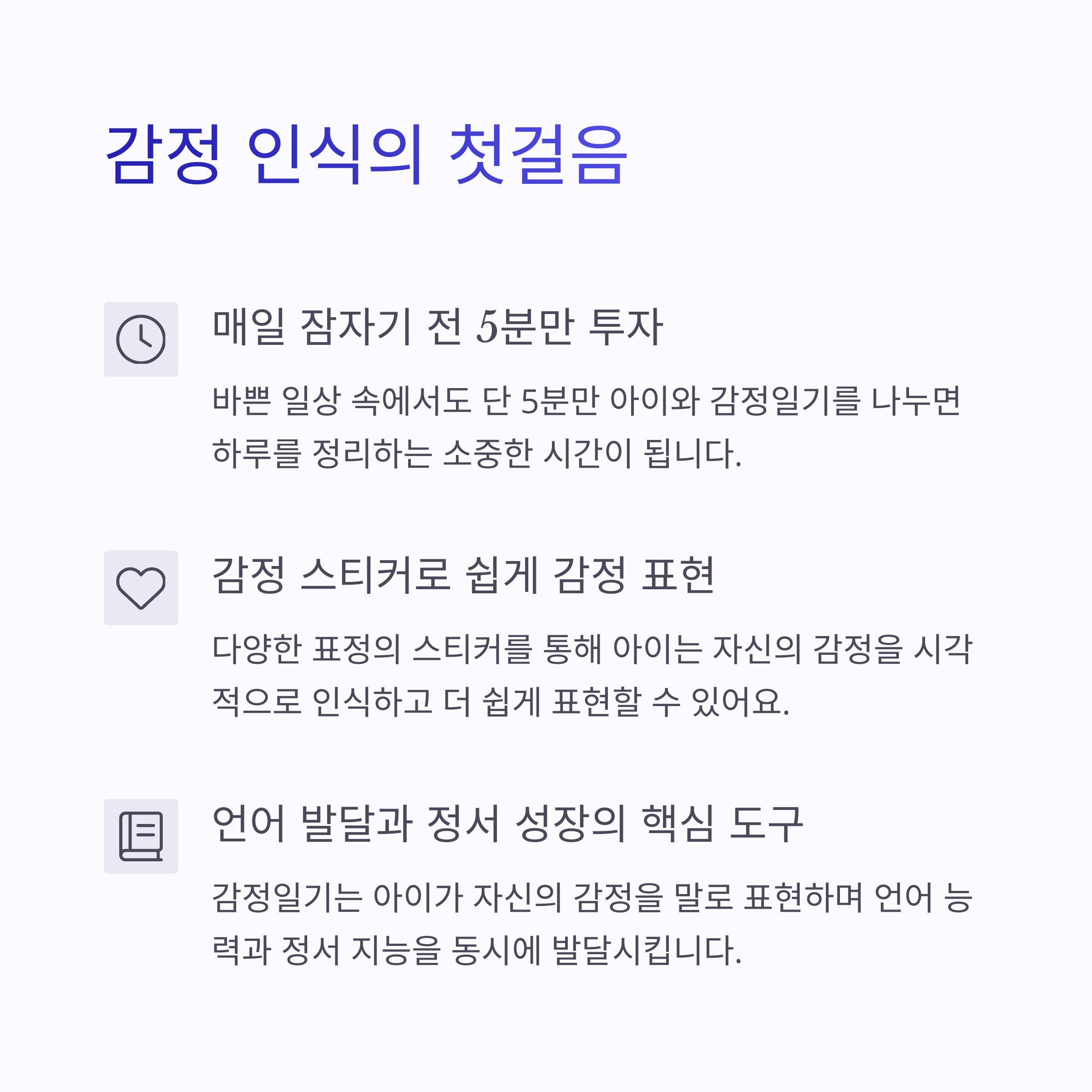 잠들기 전, 아이 마음을 꺼내보는 이 작은 루틴이 아이의 하루를 정리해주고, 감정 표현력을 길러줍니다. 감정일기는 하루의 감정을 마무리하고 아이와 깊은 연결을 만드는 최고의 도구예요. 오늘부터 한 장, 함께 시작해보세요.