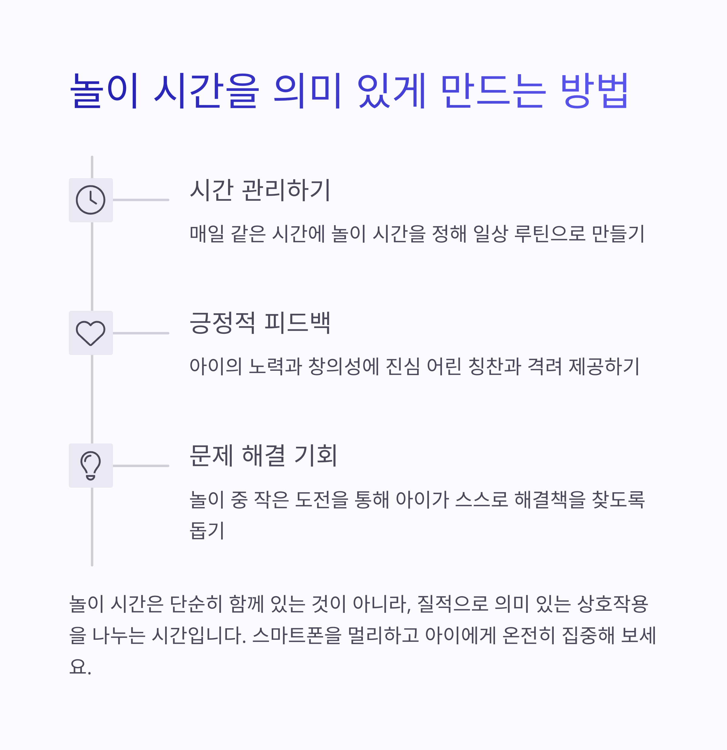 - 시간 관리: 놀이 시간 동안은 모든 전화, 업무 등 방해 요소를 차단하세요.