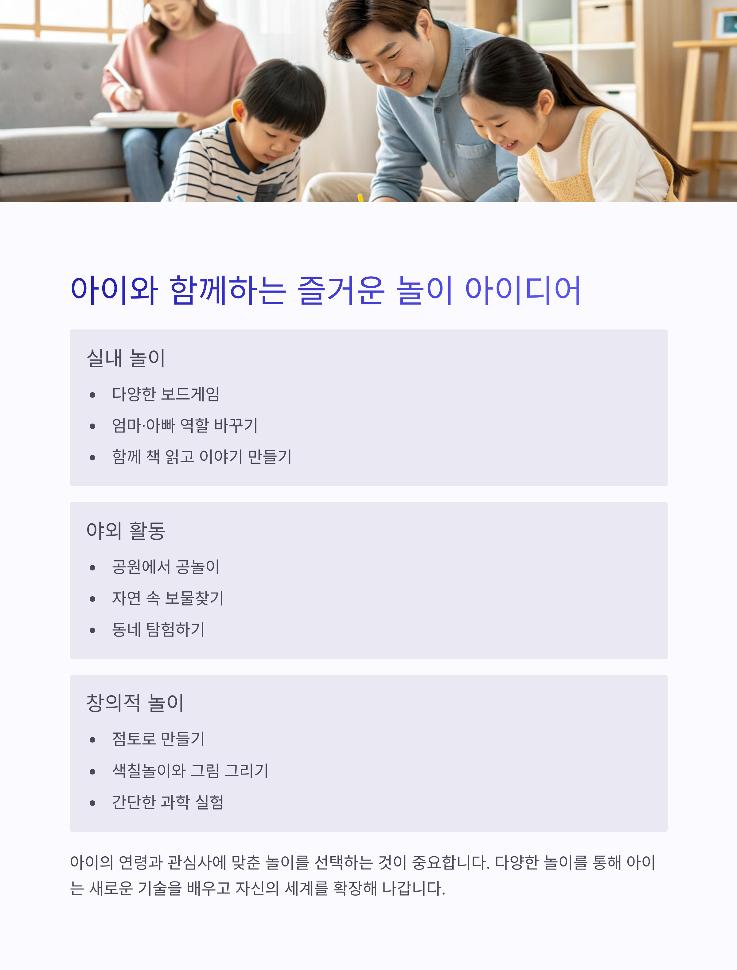요약: 아이와 하루 30분 가족 놀이를 함께하면 긍정적 감정 발달, 가족 간 유대 강화, 그리고 사회성 향상에 큰 도움이 됩니다.