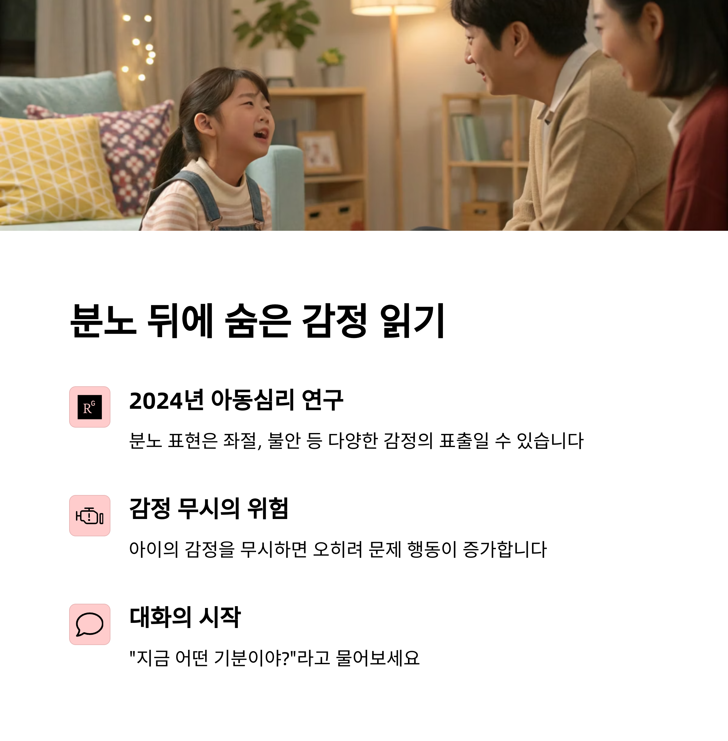 아이와의 대화는 분노를 해결하는 중요한 열쇠입니다. 다음 기술들을 적용해보세요: