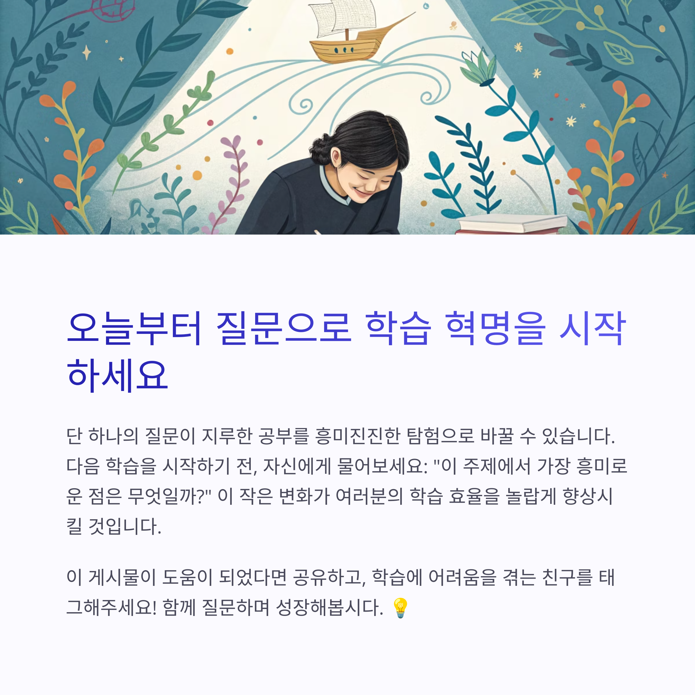 공부를 강요하지 말고, 흥미를 끌어내는 질문 한 가지를 던져보세요. 간단한 질문으로 공부 자체가 흥미로운 여정이 됩니다. 오늘부터 '왜 이게 중요할까?' 같은 질문을 생활화해보세요. 😊