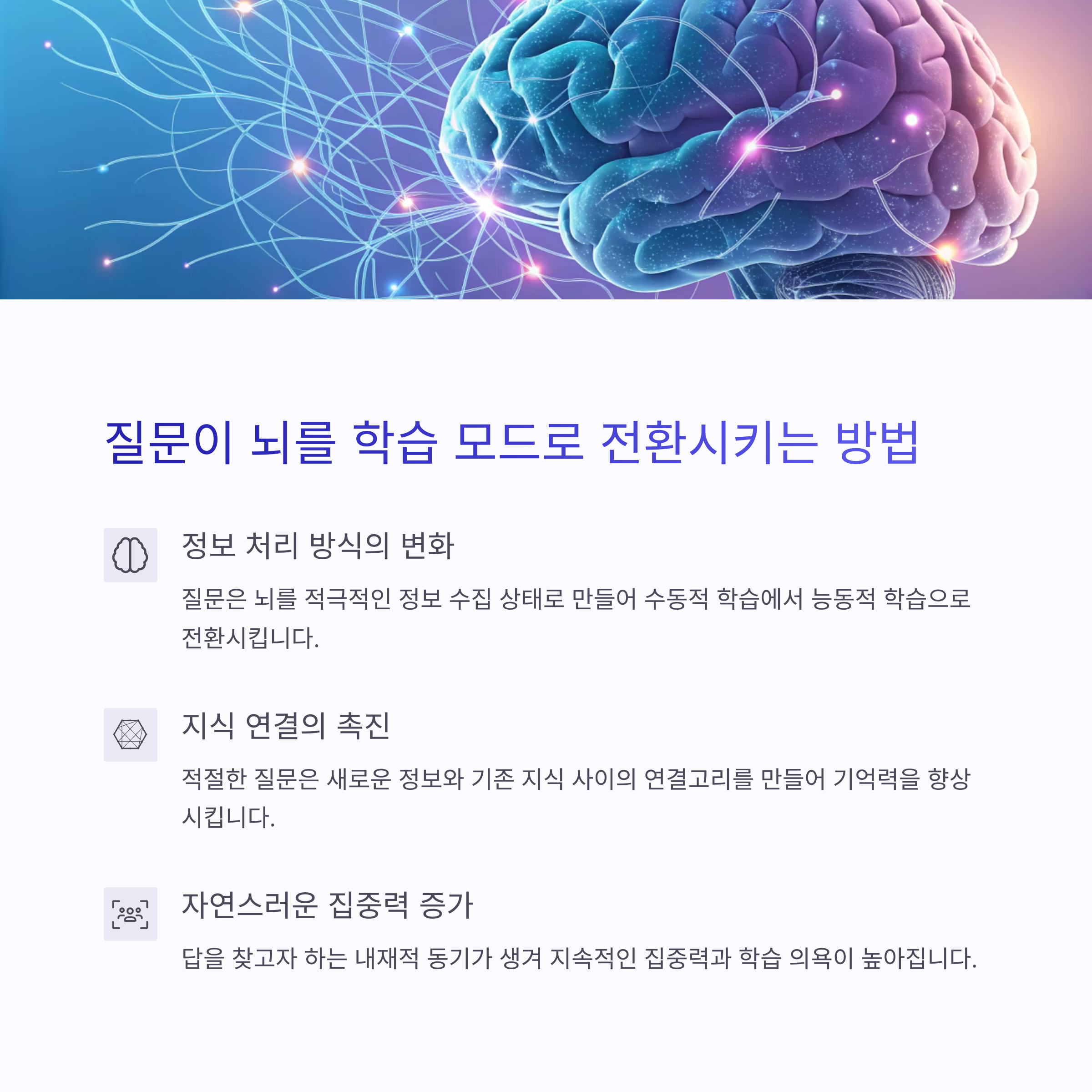 | 집중력 증가 | 질문에 대한 답을 찾기 위해 더 몰입하게 됩니다. |