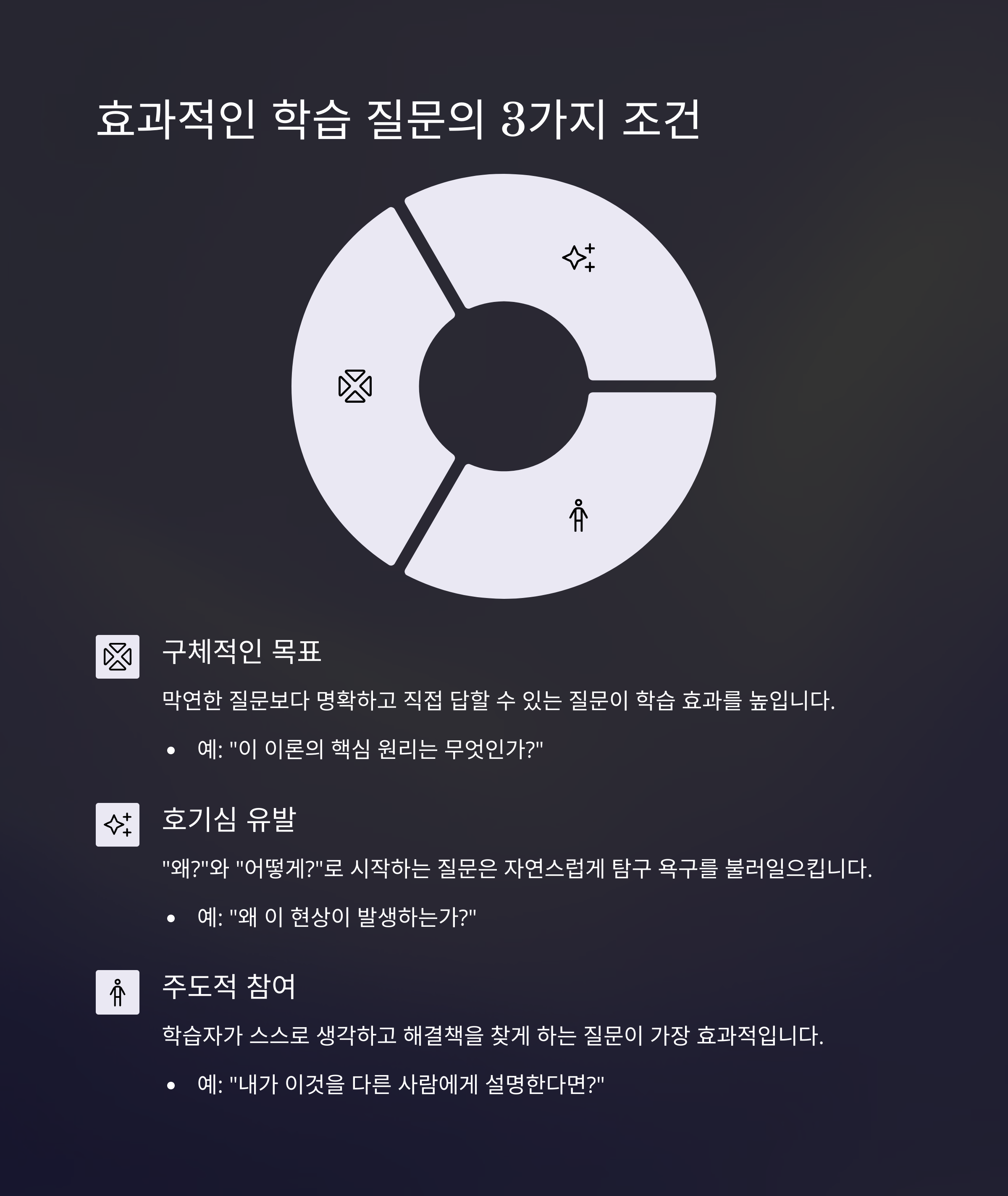 • 구체적으로 질문하기: 예) '왜 이게 중요할까?' 대신 '이 방법이 효과적인 이유는 무엇일까?'
