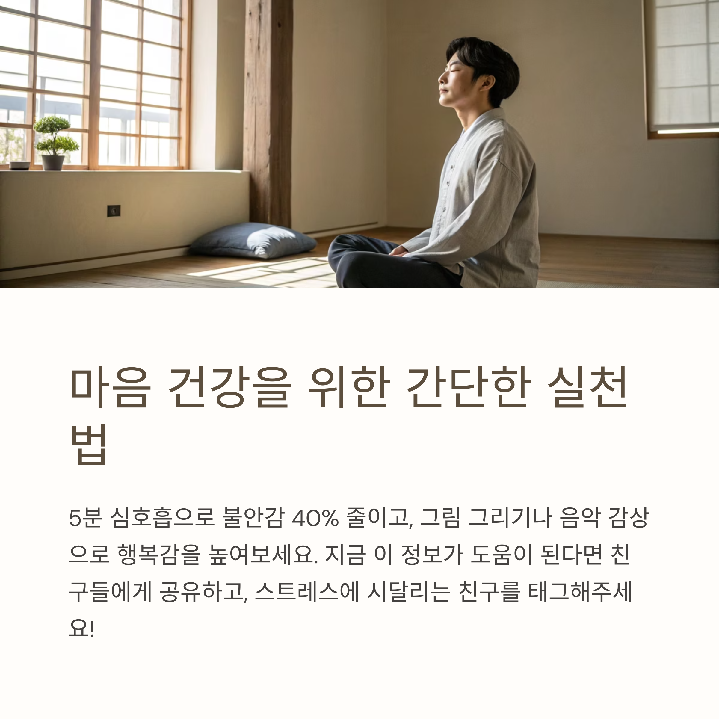- 🧘♀️ 호흡과 명상: 하루 5분 조용한 곳에서 심호흡하거나 명상해보세요. 긴장이 풀릴 거예요.