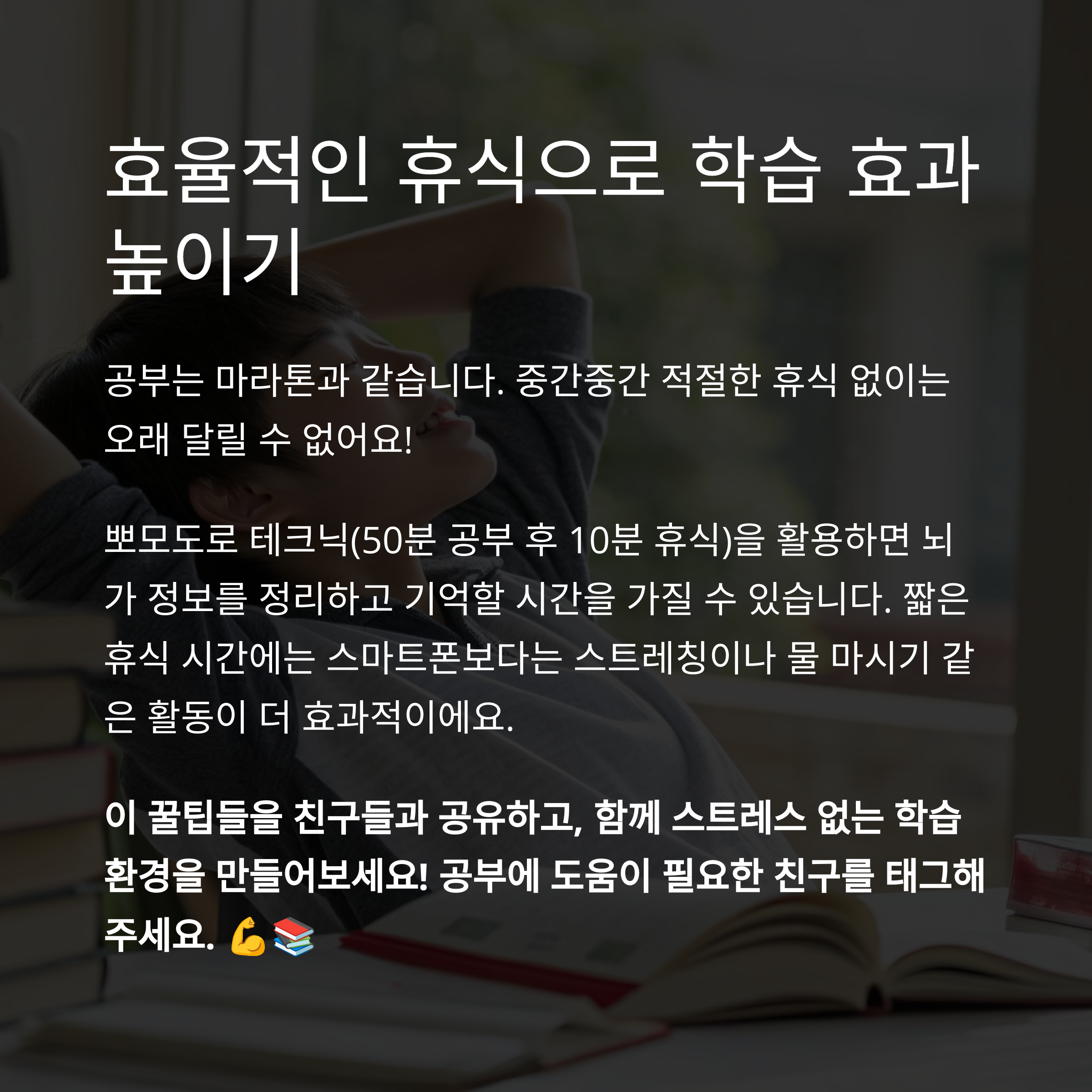 위의 꿀팁을 적용해 공부 스트레스를 조금씩 줄여보세요. 여러분 모두 집중력 UP, 성적은 더 UP 되길 응원합니다! 🎓