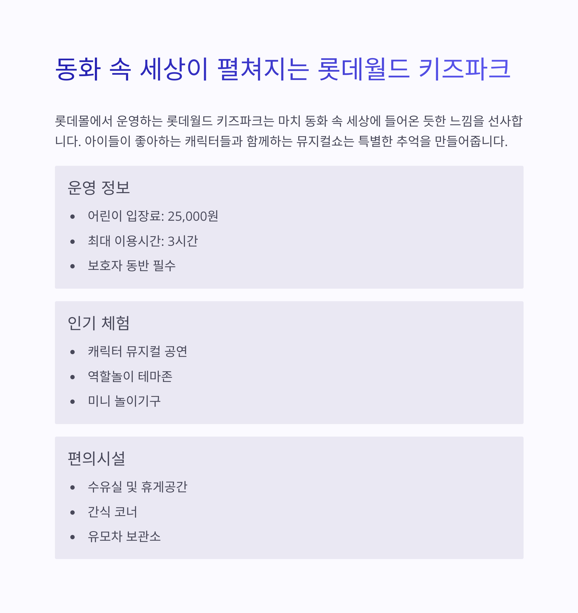 | 롯데월드 키즈 | 서울 | 테마파크 내 키즈존 | 약 30만 명 |