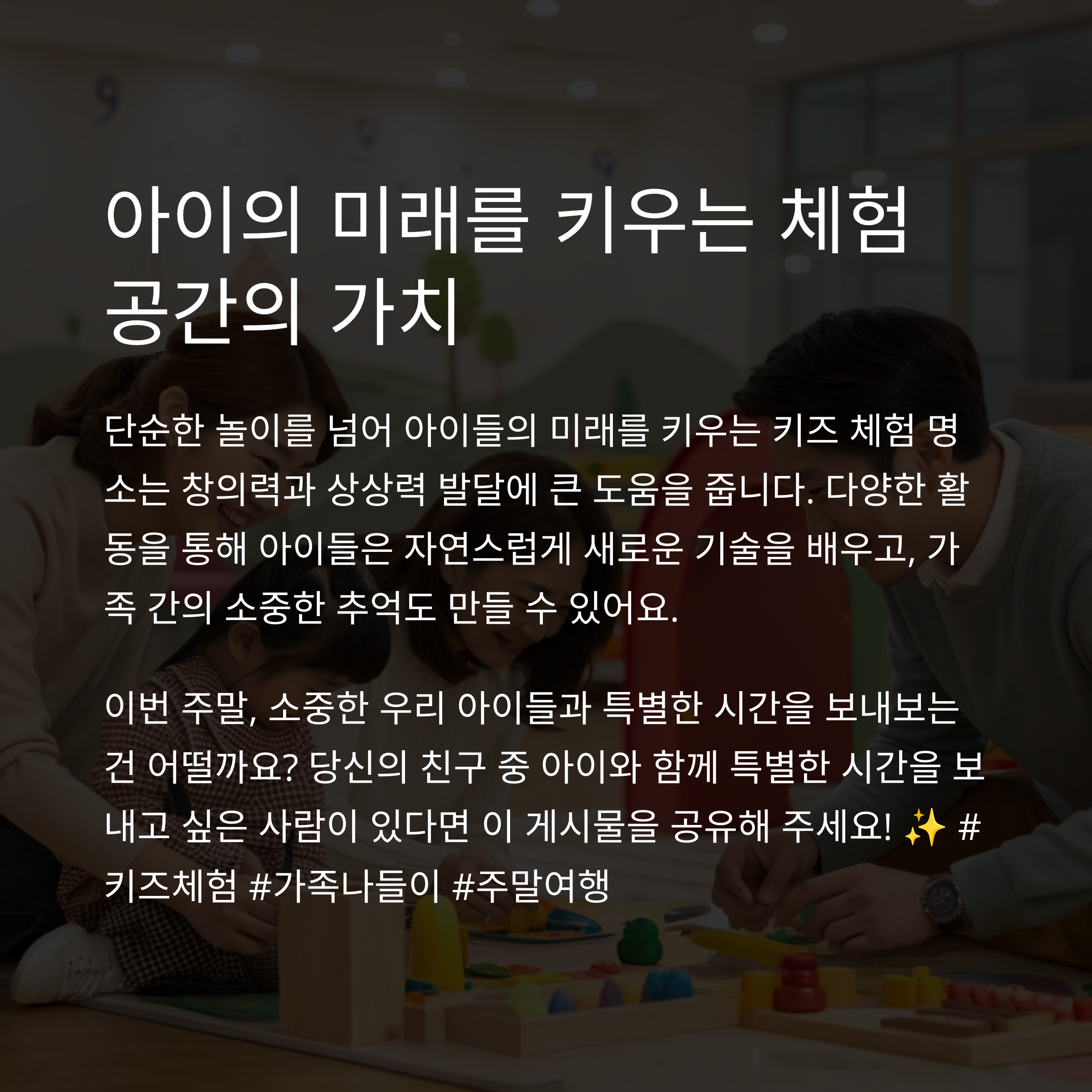 오늘은 놀이와 교육을 겸비한 키즈 체험 명소에 대한 내용을 준비했습니다. 다양한 실내외 장소에서 아이들과 함께 즐겁게 놀며 학습하는 기회, 놓치지 마세요!