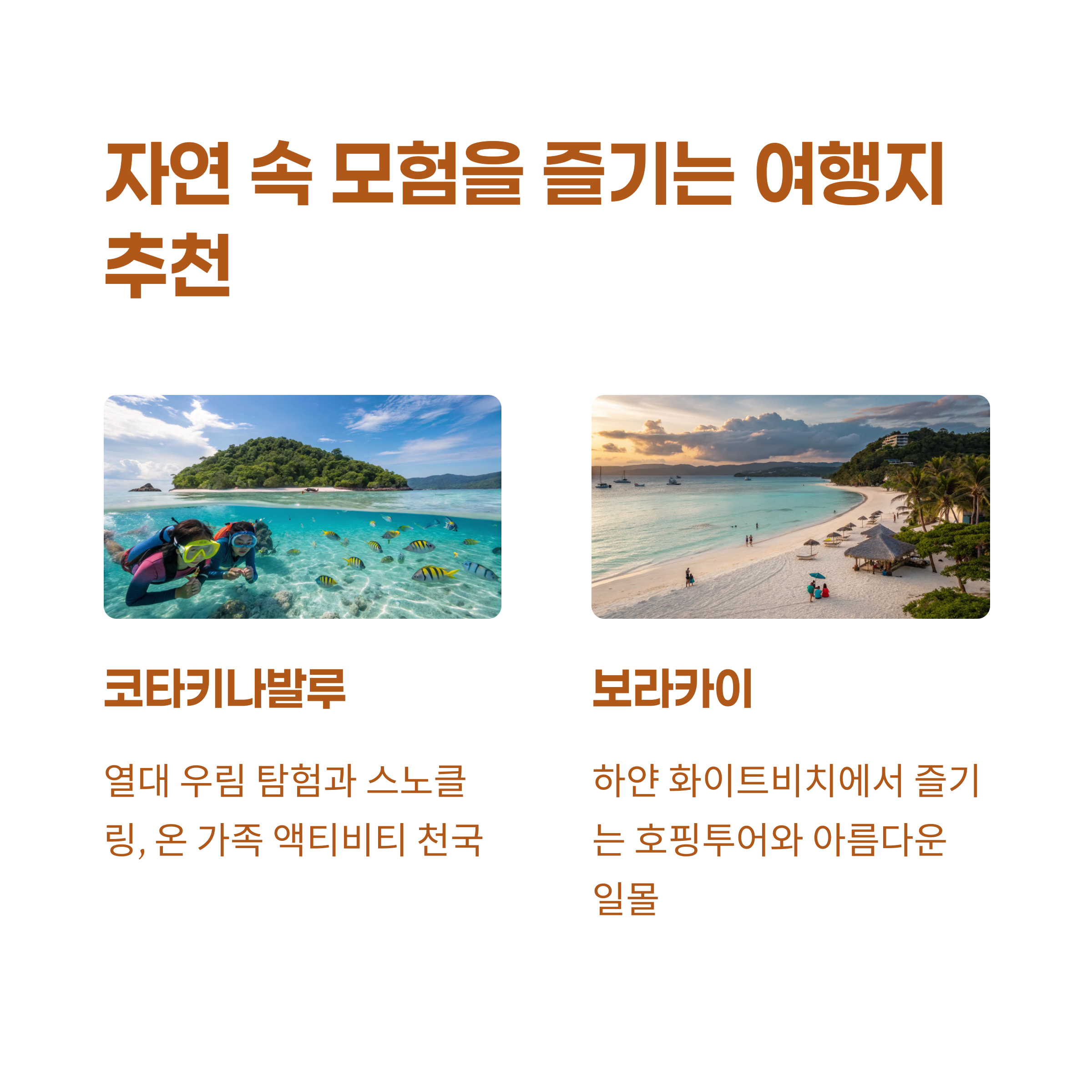 | 트레킹, 스노클링 등 다양한 액티비티 | 한국에서의 항공 노선은 다소 적음 |