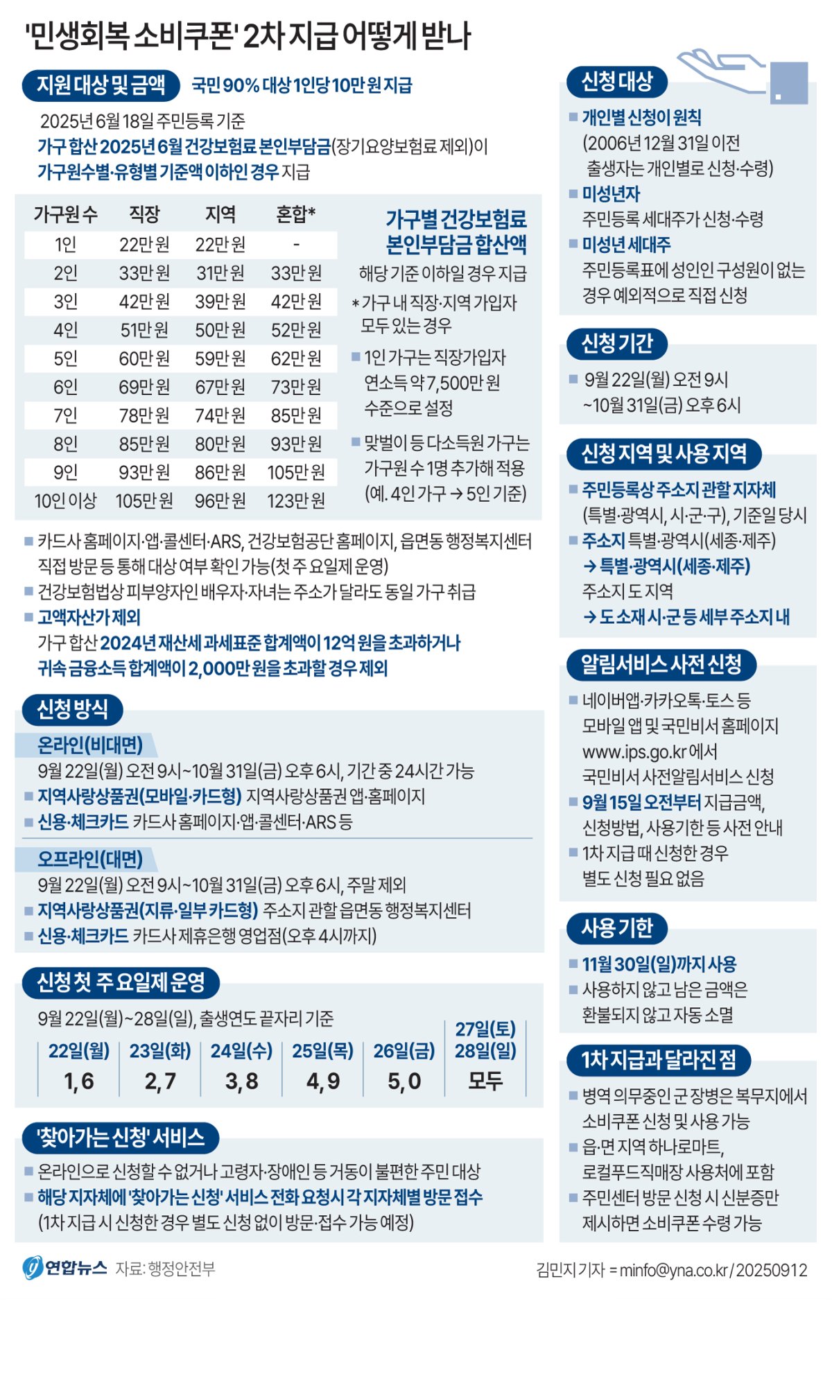 요약: 9/22~10/31 신청, 11/30까지 사용. 대상은 건강보험료 기준 충족자(가구별), 재산세 과세표준 12억·금융소득 2천만 초과는 제외. 사용은 주소지 관할 지역 내, 전통시장·동네상권 중심.