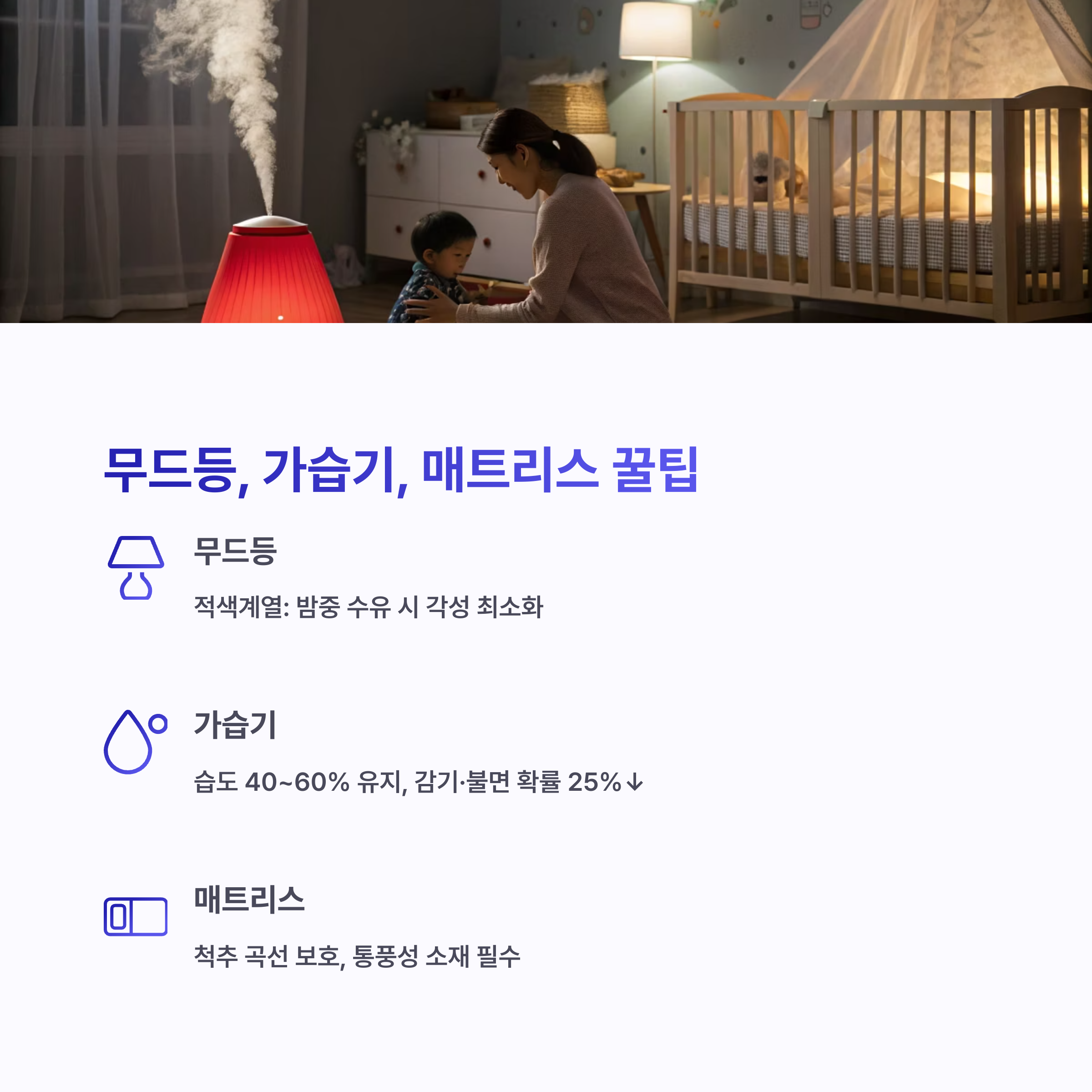 밤중 수유나 기저귀 교체 시 필요한 은은한 조명입니다. 과도한 빛 노출을 방지하는 무드등은 아기의 생체 리듬을 보호합니다.