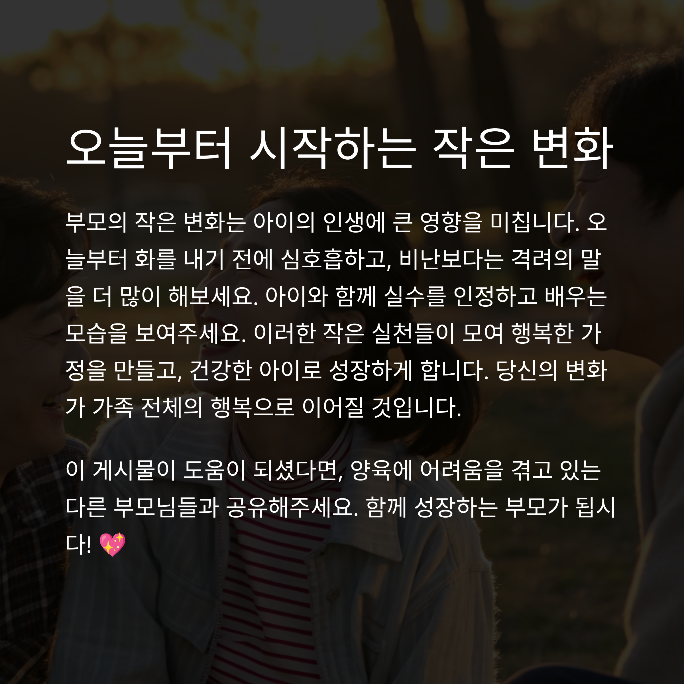 지금부터 여러분도 부모로서의 변화를 만들어보세요. 아이와 함께 행복을 만들어가는 하루 되시길 바랍니다!