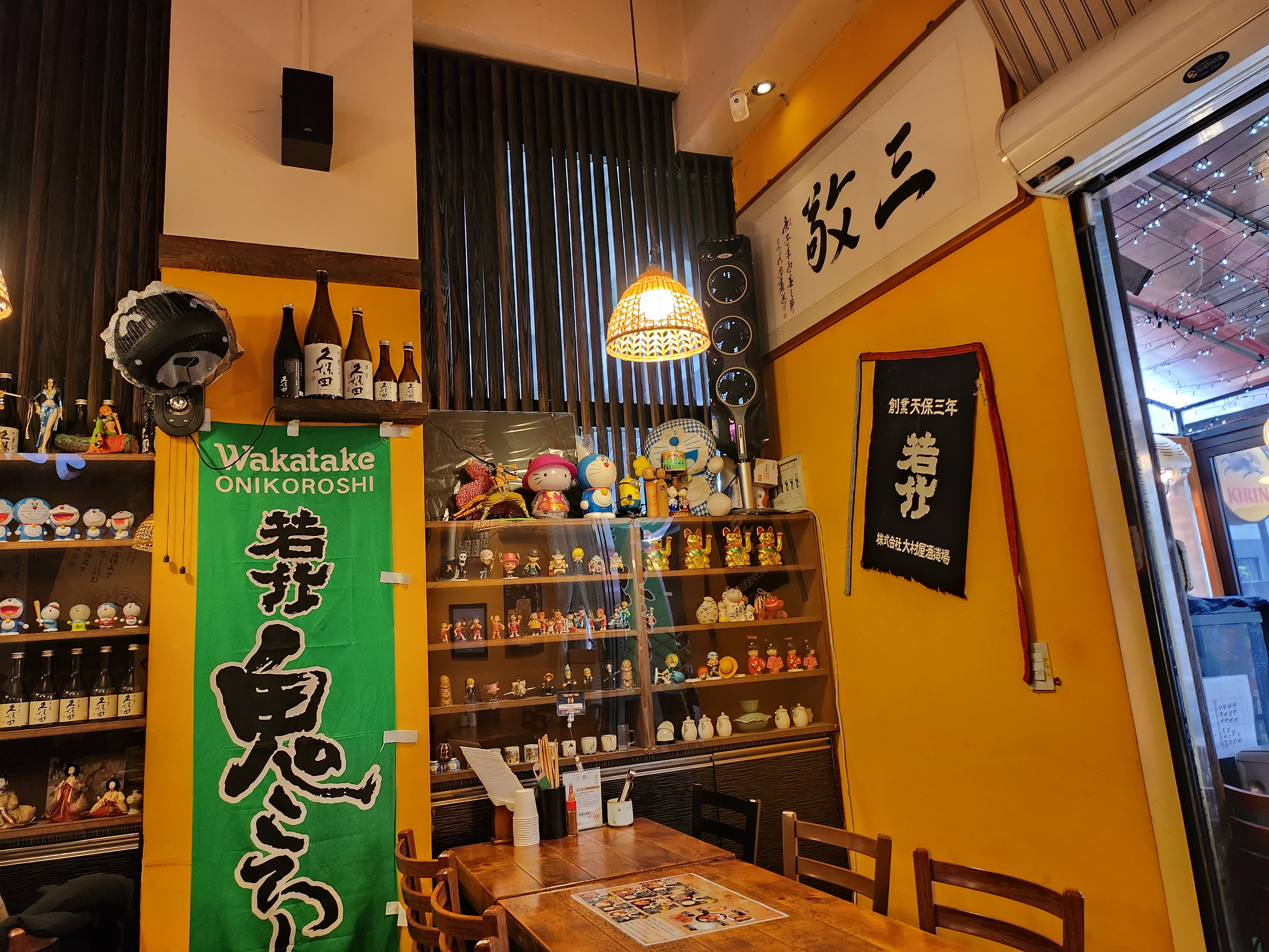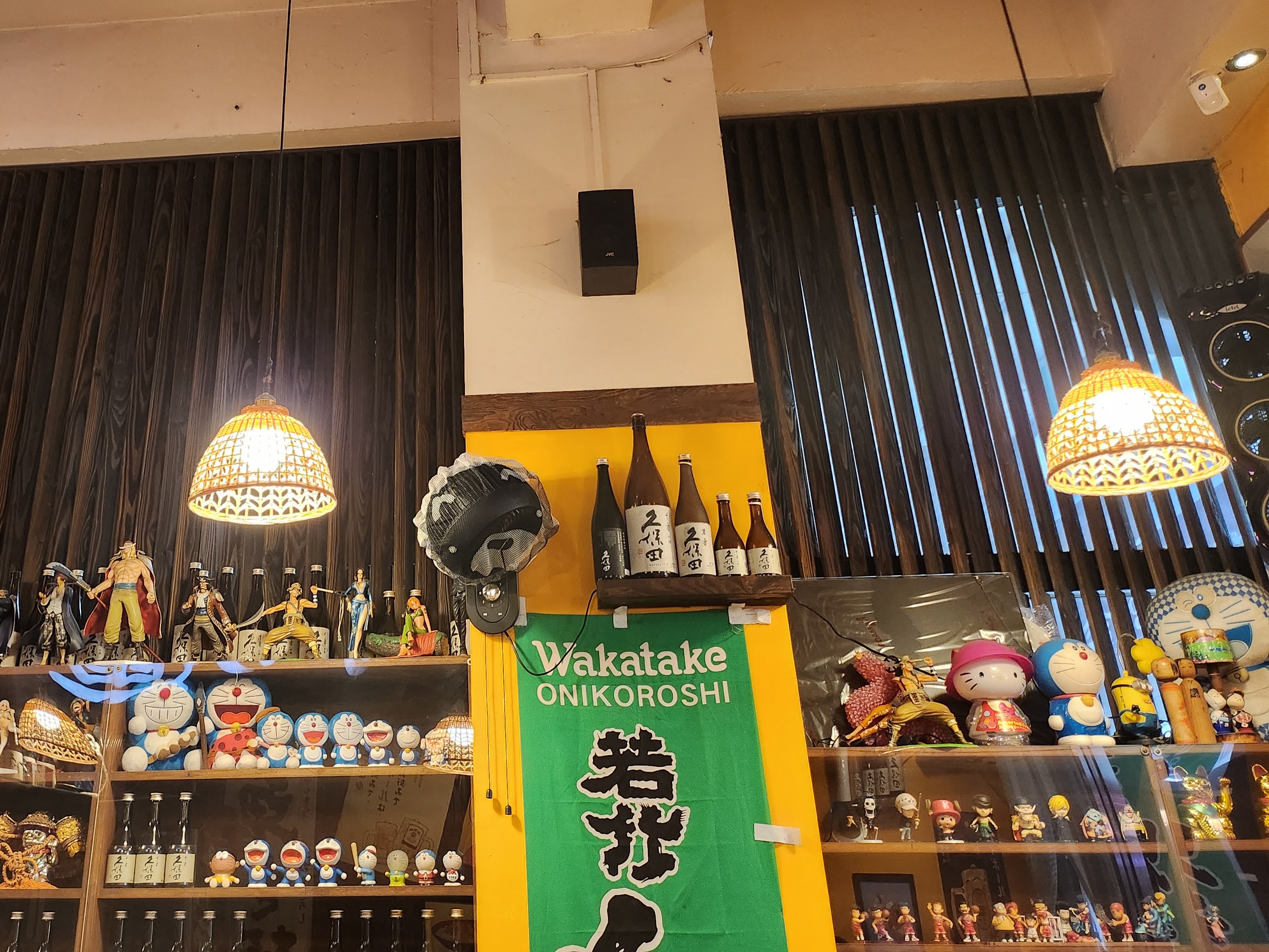 가게 문을 열자마자 눈길을 사로잡는 건 바로 가득한 도라에몽 피규어와 사케 병들이었어요. 노란 벽과 원목 테이블, 일본식 포스터와 천 장식까지 분위기가 정말 일본 이자카야 그 자체! 특히 각 테이블마다 프라이빗한 느낌이 드는 공간 구성이 매력적이라, 데이트는 물론 가족 식사에도 제격이에요.