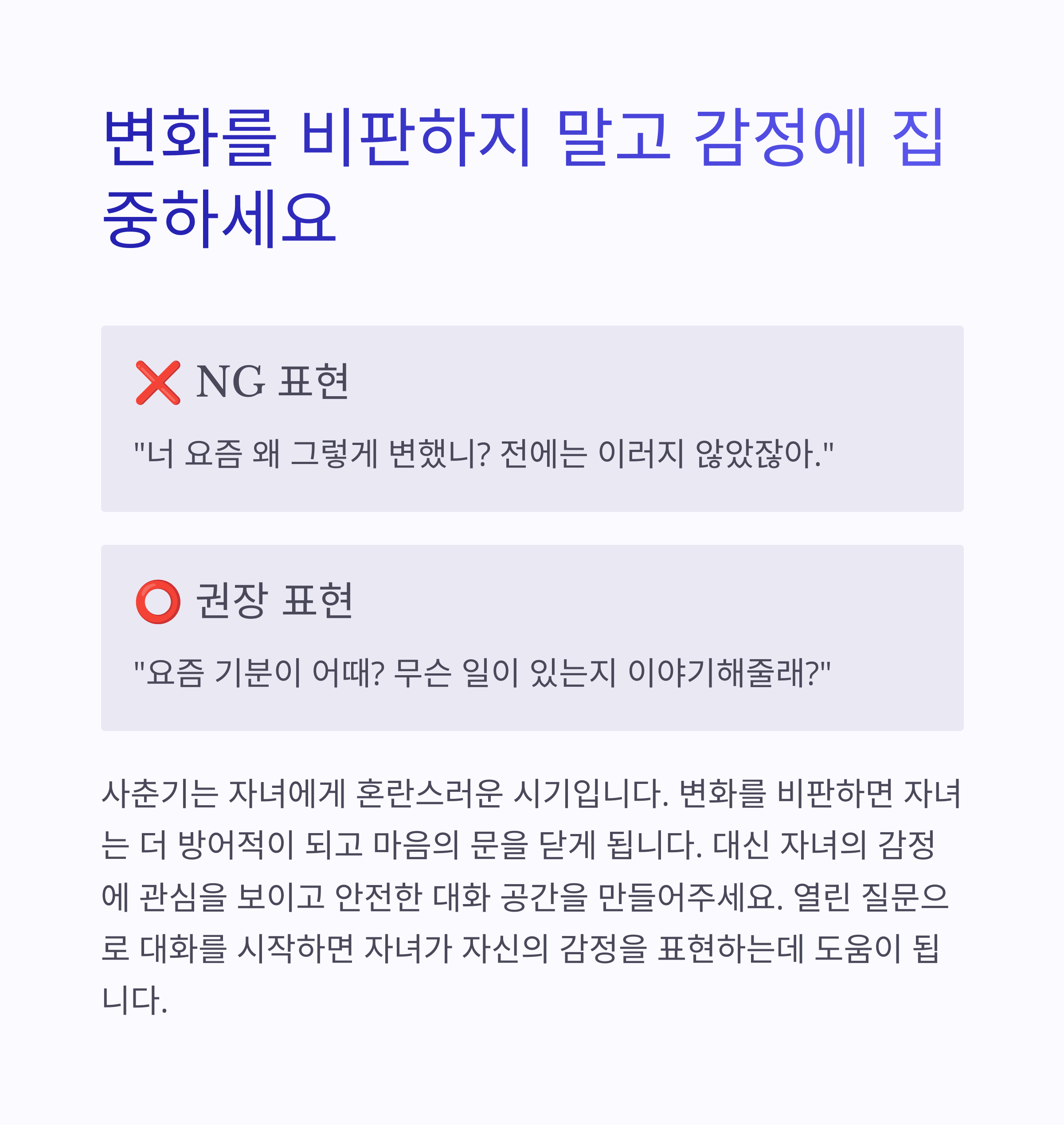 부모님 입장에서는 예전과 달리 감정 기복이 심해지고 반항적인 태도를 보이는 자녀가 낯설게 느껴질 수 있습니다. 하지만 이런 질문은 아이에게 상처를 줄 수 있어요. 자녀는 스스로가 받아들여지지 않는다고 느낄 수 있습니다. 대신 이렇게 표현해 보세요: