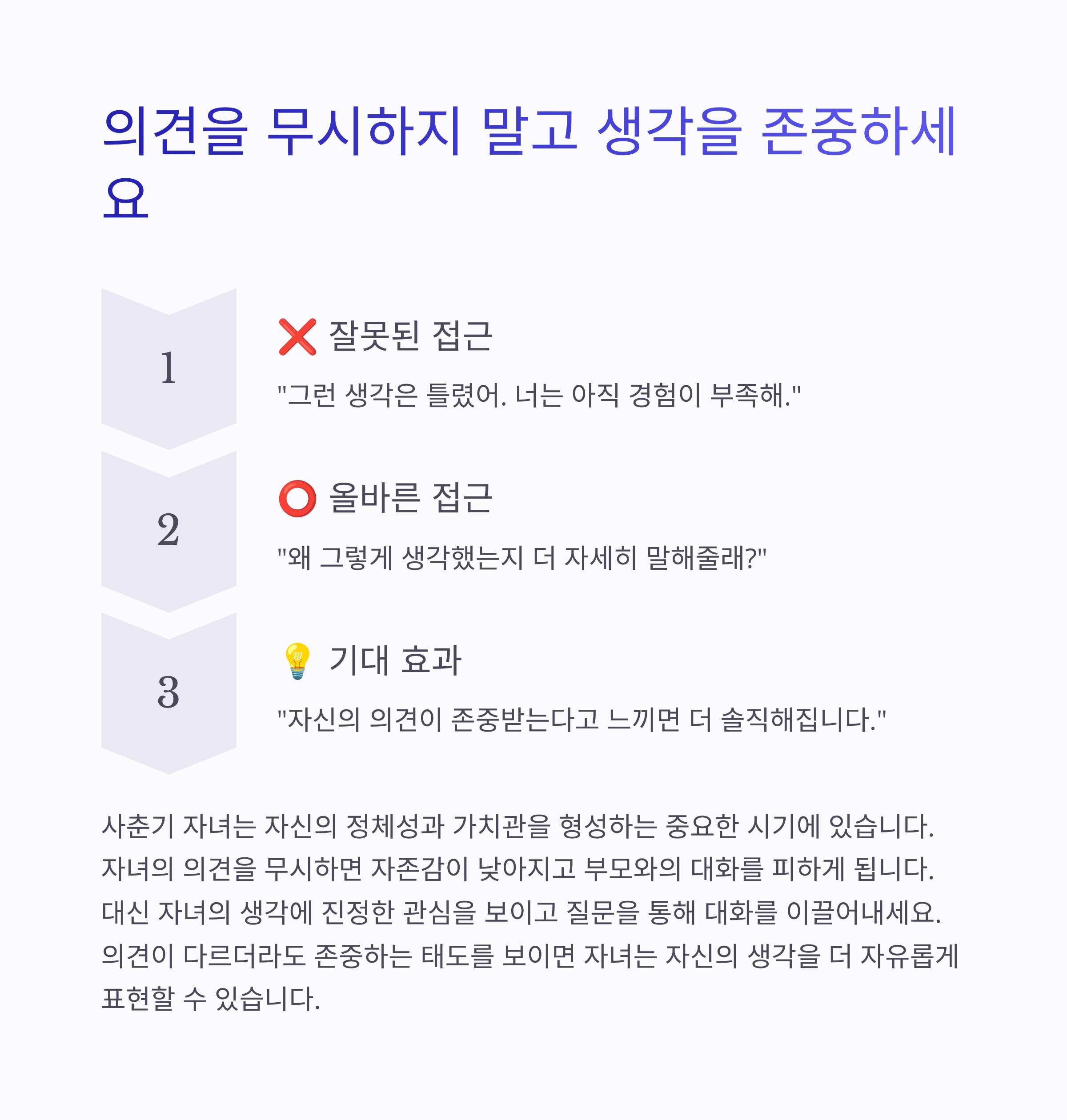 자녀가 의견을 표현했을 때 무시하거나 깎아내리는 말은 자녀의 자신감을 크게 떨어뜨릴 수 있습니다. 이런 표현은 자녀의 자존감을 해칠 수 있어요. 대신 다음과 같이 대화를 이끄는 것이 좋습니다: