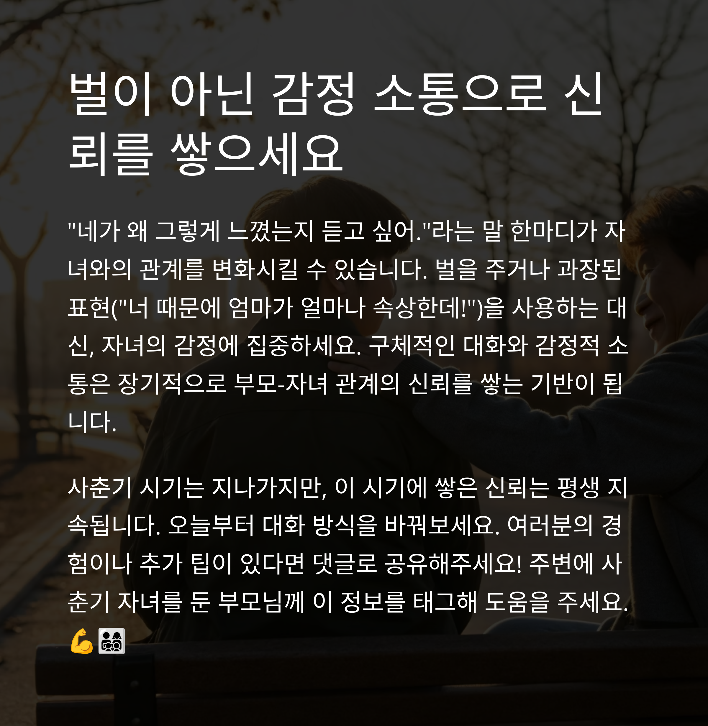사춘기 자녀와의 대화는 복잡하고 어려운 경우가 많지만, 위에서 소개한 표현만 조금 바꿔도 큰 변화를 가져올 수 있습니다. 😊 자녀의 입장에 공감하고, 열린 마음으로 접근하는 자세가 중요합니다. 대화의 문을 열기 위해 오늘 소개한 요소들을 기억해 보세요!