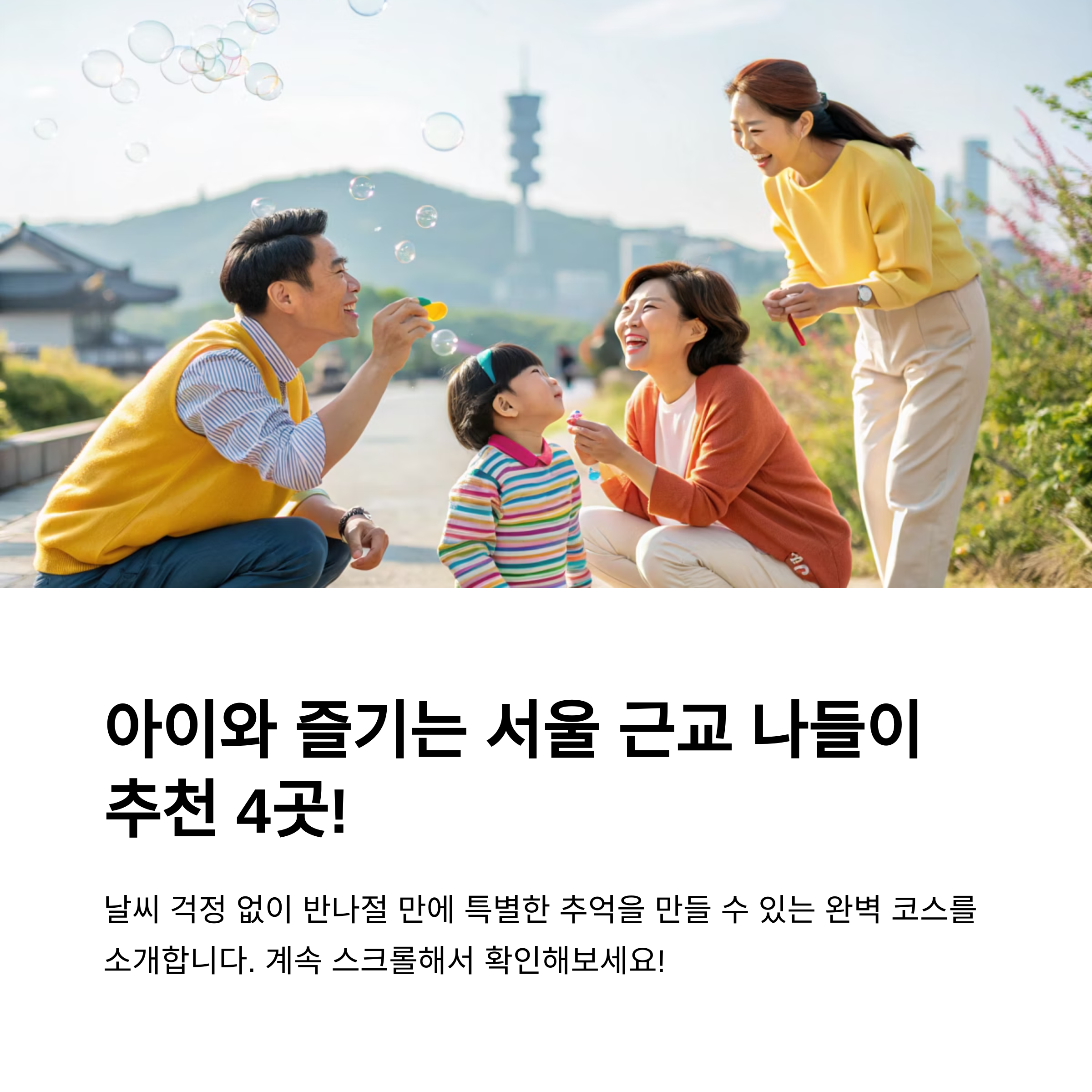 엄마아빠들, 혹시 아이랑 서울 근교에서 어디로 갈지 아리송한 날 많으시죠? 오늘은 딱 반나절, 아이들과 제대로 행복해질 수 있는 코스를 확실히 추천해 드릴게요! 부모님도 힐링할 수 있는 곳이니 놓치지 마세요.