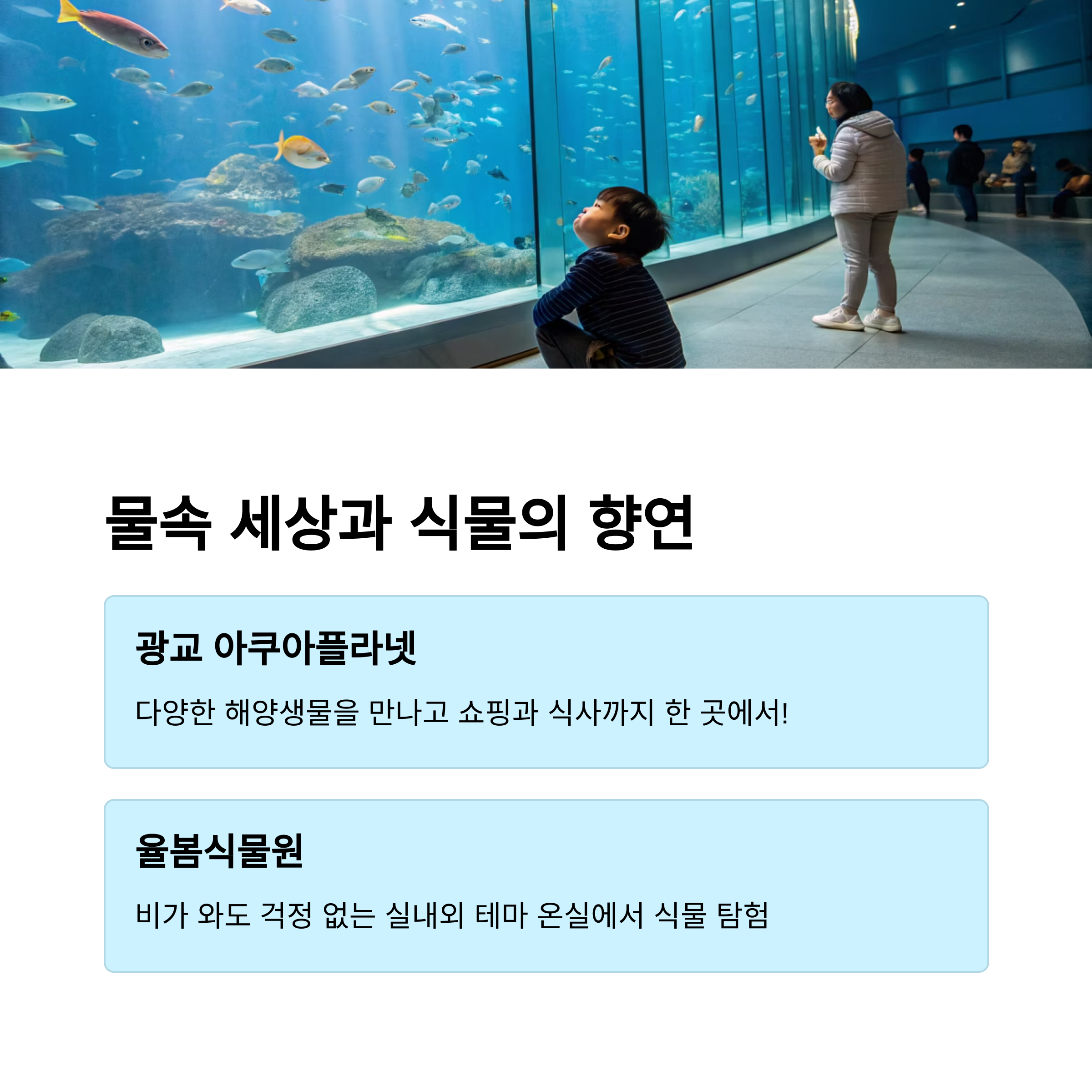 A: 네, 예를 들어 봄에는 야외식물원을, 여름엔 아쿠아리움을 추천드려요. 날씨에 맞춰 장소를 선택하세요!