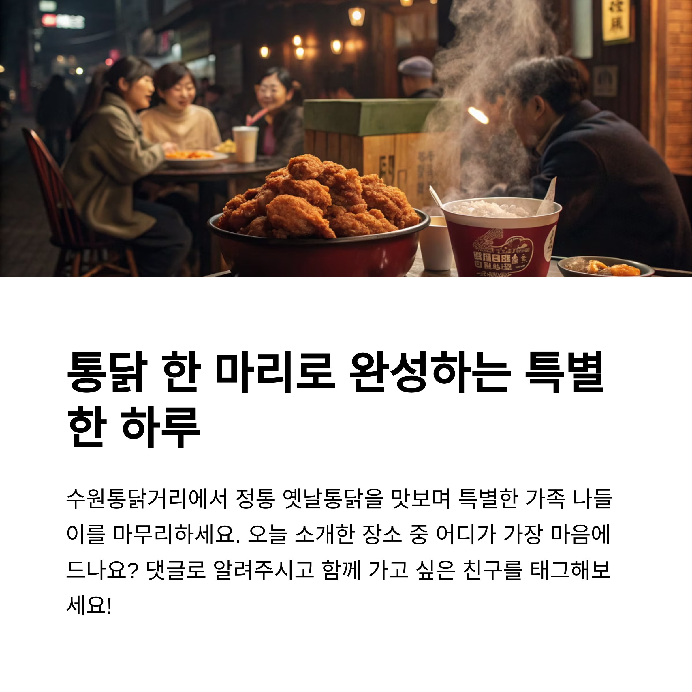 마지막까지 맛있게 즐겨야죠! 수원통닭거리는 아이들도 엄청 잘 먹는 맛집 천국입니다. 간단히 무예 공연도 함께 보면 좋겠죠?