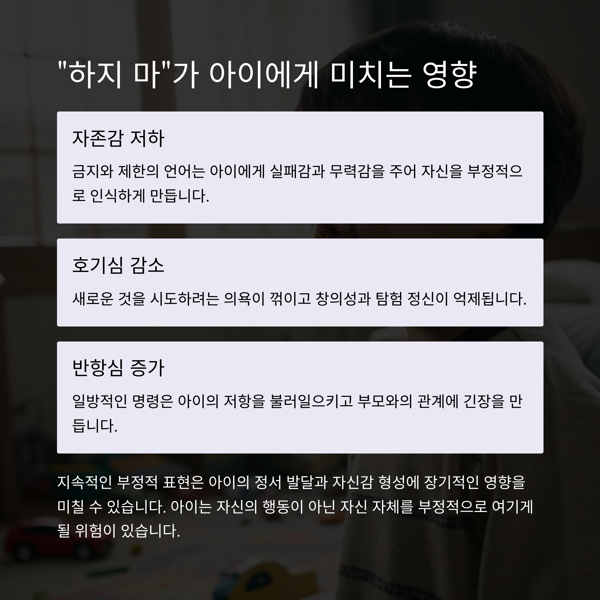 "하지 마"는 즉각적인 중단을 요구하는 강압적인 명령어로, 아이의 행동을 멈추게 할 수 있지만 부작용도 만만치 않습니다: