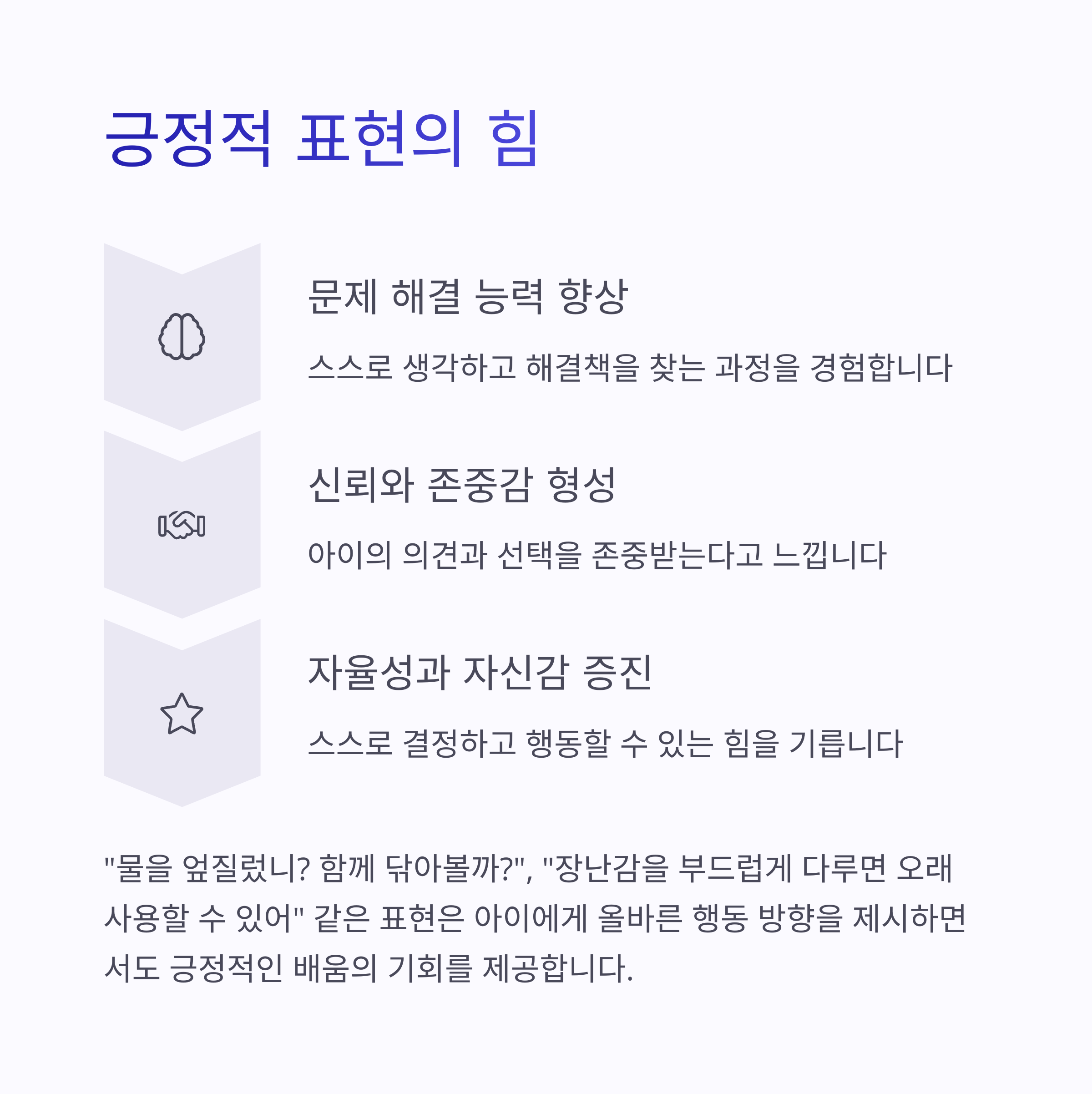 3. 📣 긍정적 언어 사용: "싫어"보다는 "좋아"에 초점을 둡니다.