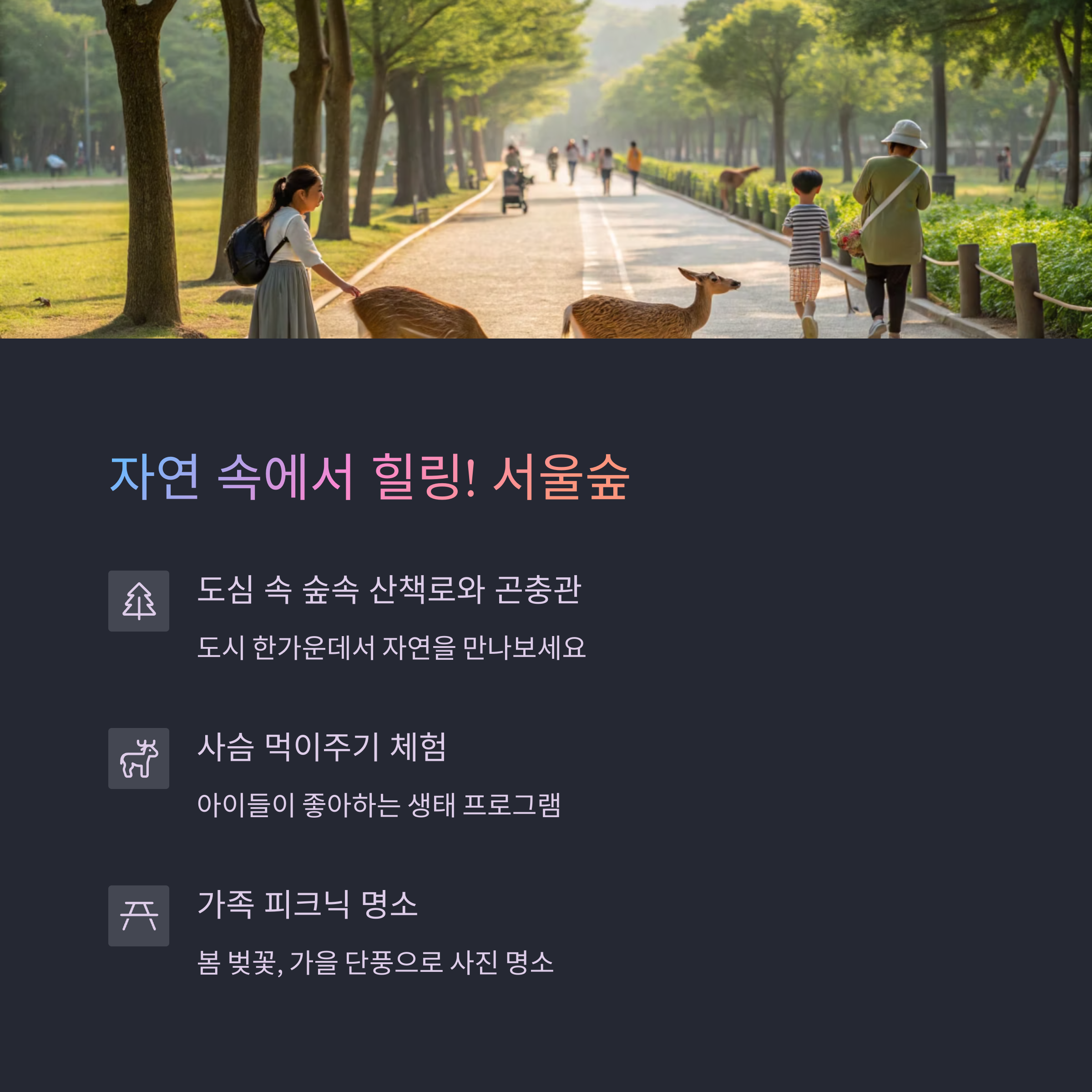 서울숲은 넓고 깨끗한 공간은 물론, 아이들이 나무와 풀, 곤충까지 가까이 접할 수 있는 자연 놀이터입니다. 이곳에서 산책만 해도 힐링되고, 나비정원과 물놀이터까지 준비되어 있어요.