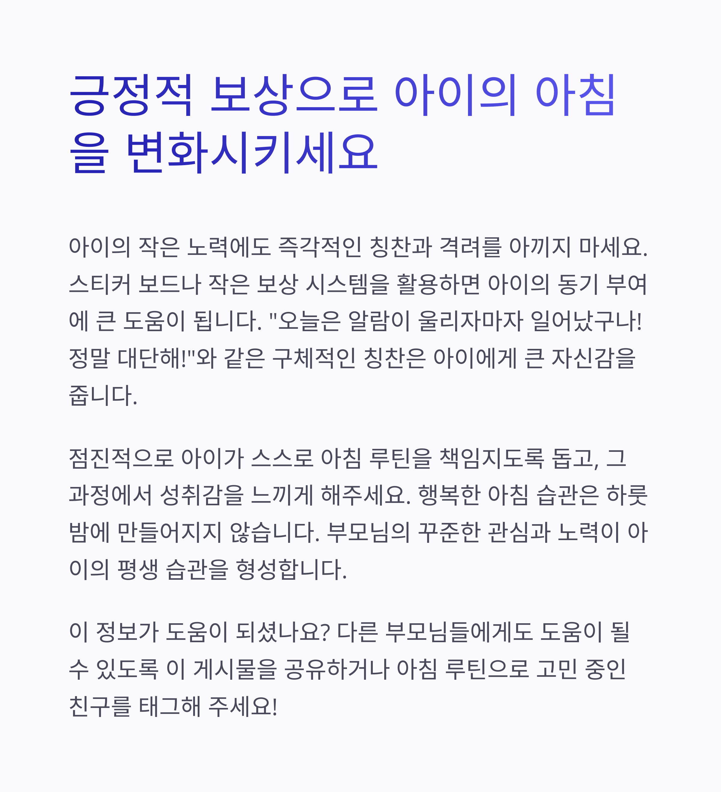 아이의 아침은 부모의 노력과 관심에서 시작됩니다. 이 루틴을 통해 아이와 함께 더 행복한 아침을 맞이해보세요! ☀️