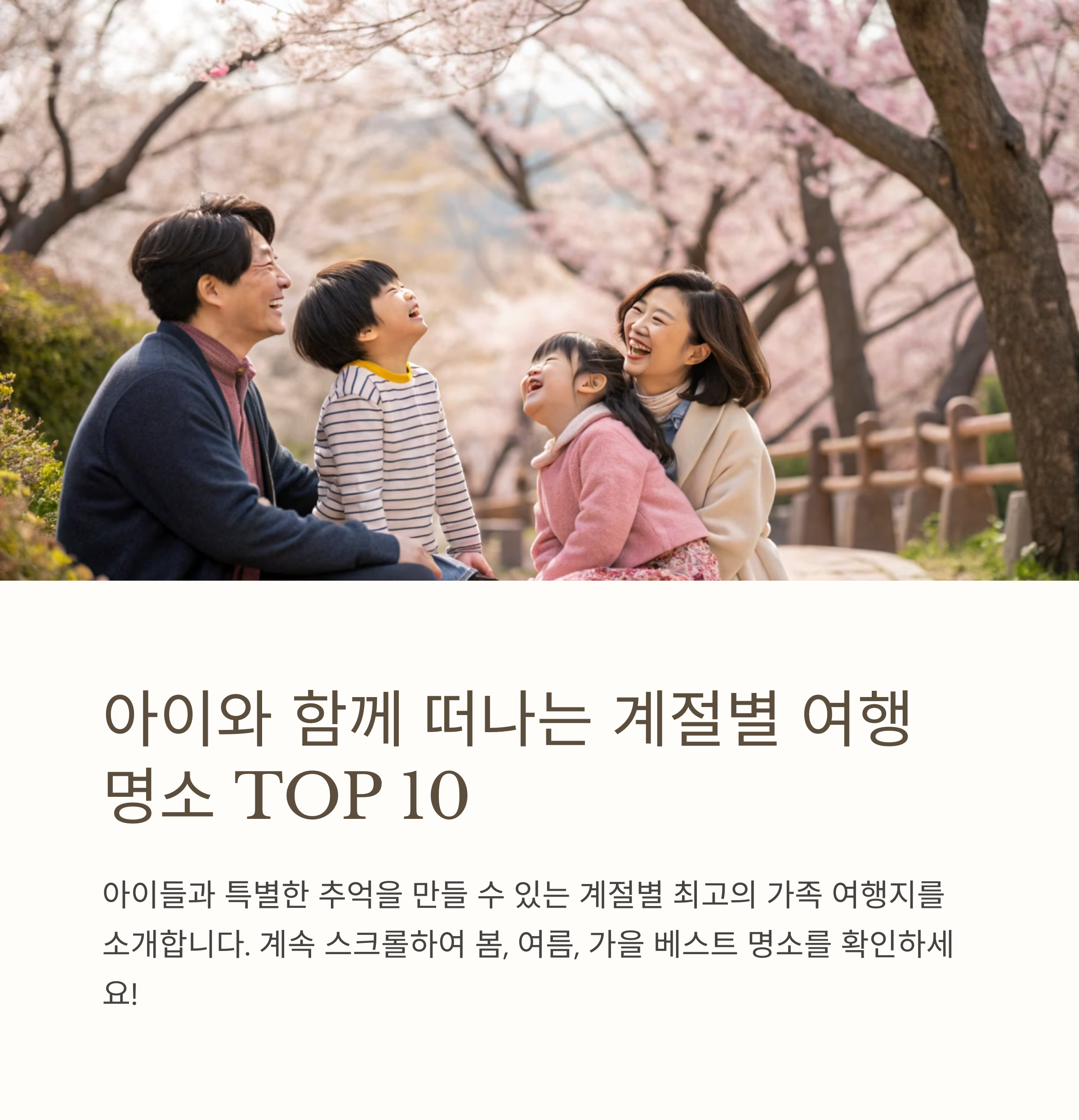 봄부터 겨울까지, 각각의 계절에서 아이와 함께 꼭 가봐야 할 명소를 소개합니다. 자연, 역사, 놀이시설까지 알차게 준비했으니, 가볍게 읽고 계획을 세워보세요!