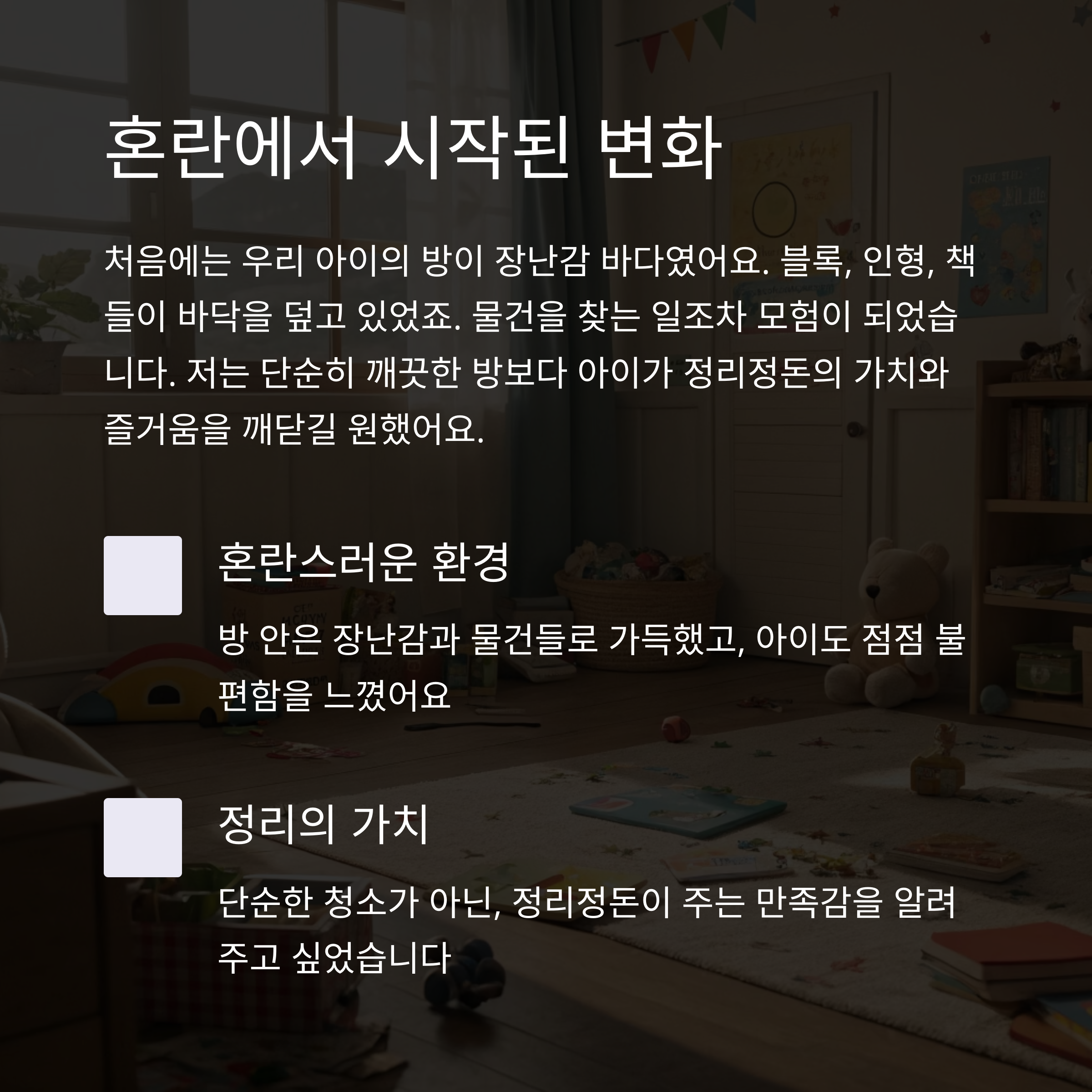 그때 저는 결심했습니다. 우리 아이가 단순히 지시를 따르는 게 아닌, 스스로 깨닫고 정리 정돈의 중요성을 느낄 수 있게 해주고 싶었어요.