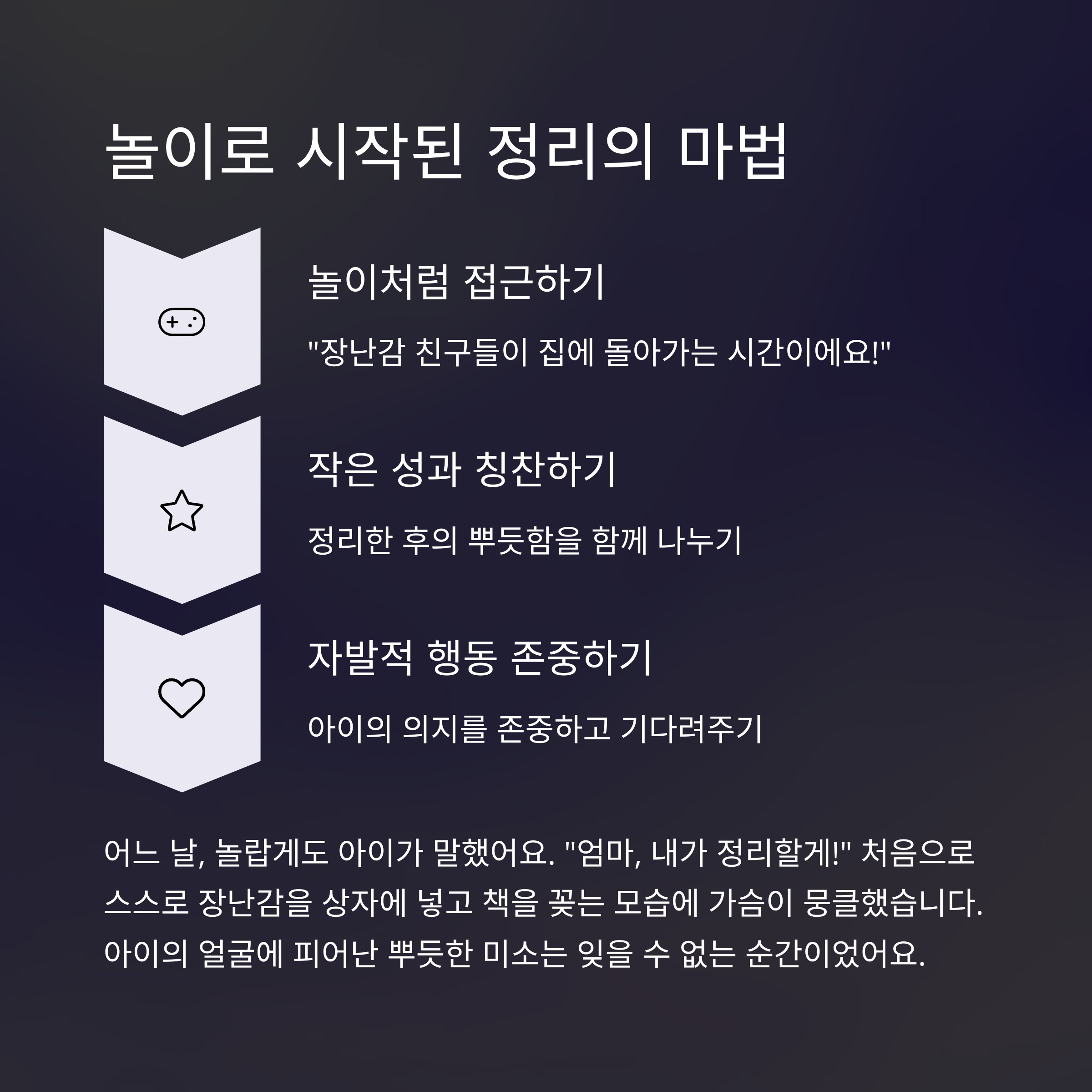 - 정리 과정을 놀이처럼 만들어 부담감을 줄이세요.
