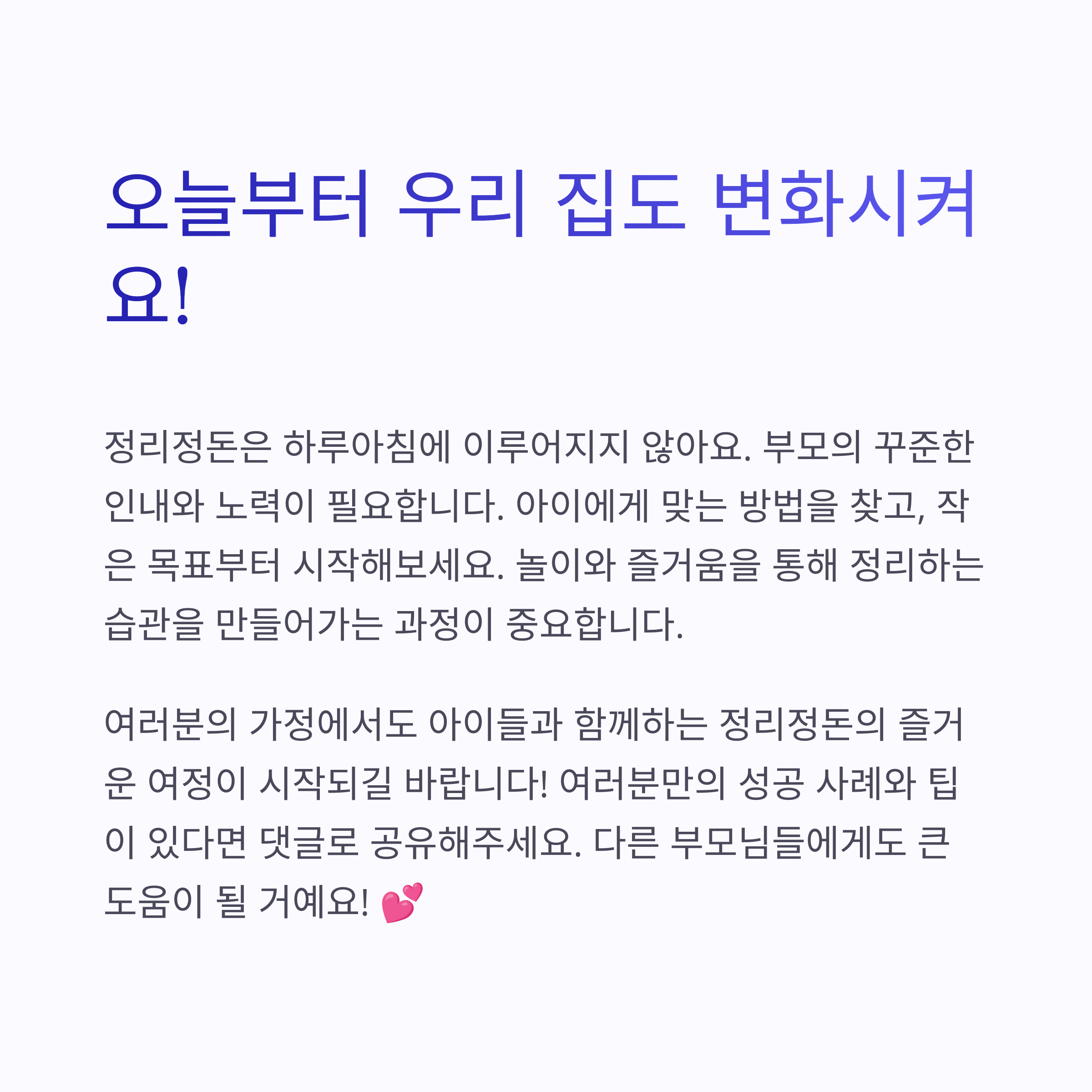 - 롤모델 되기: 부모가 직접 정리하는 모습을 먼저 보여줌.
