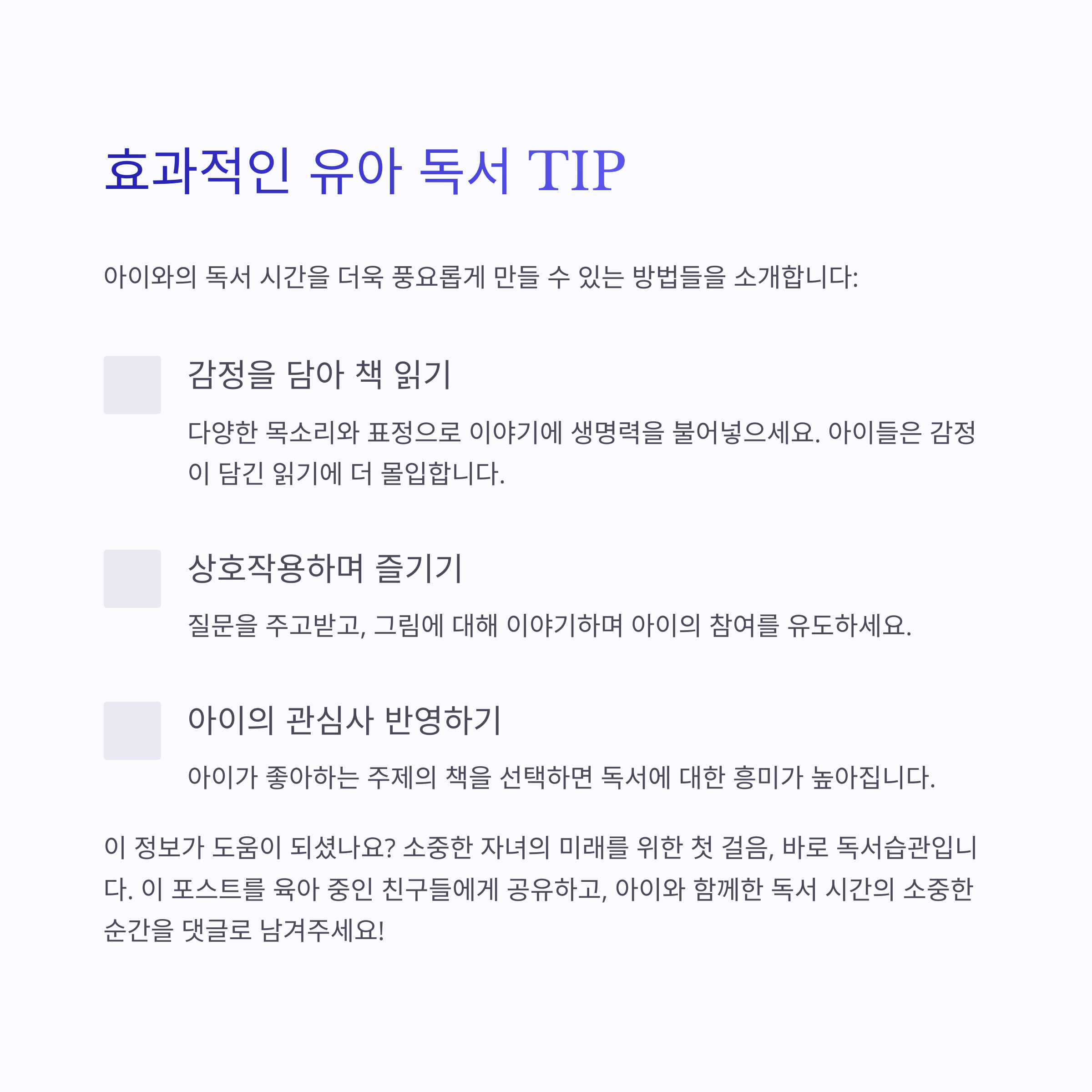 • 책 읽는 표정, 억양 살리기: 읽어주는 엄마가 재밌어야 아이도 집중!