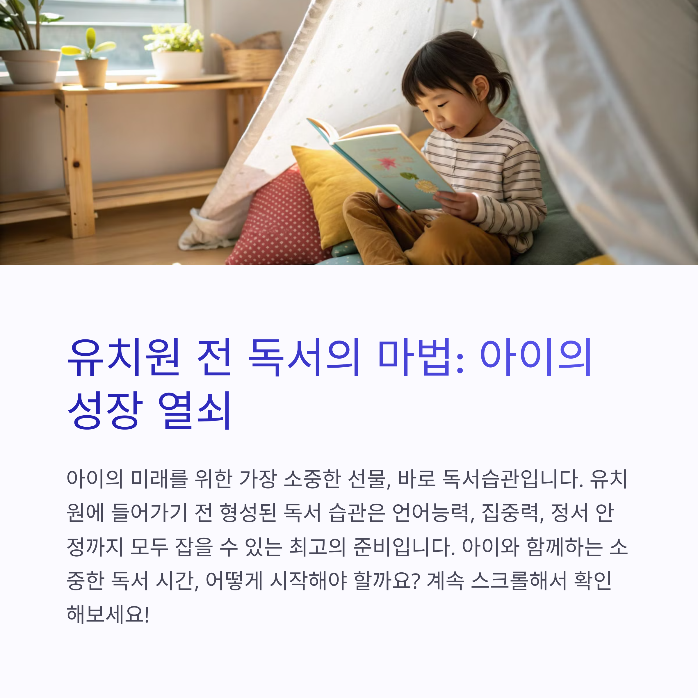 유치원 전 독서 습관은 ‘학습 준비’ 그 이상이에요. 아이에게 책은 세상을 배우는 창이고, 자기 감정을 이해하는 거울이기도 하니까요. 글자를 못 읽어도 괜찮아요. 엄마 아빠 목소리로 들려주는 책 한 권이 아이의 두뇌, 감성, 태도를 모두 자라게 합니다. 지금 이 순간부터, 함께 책을 읽어보세요.