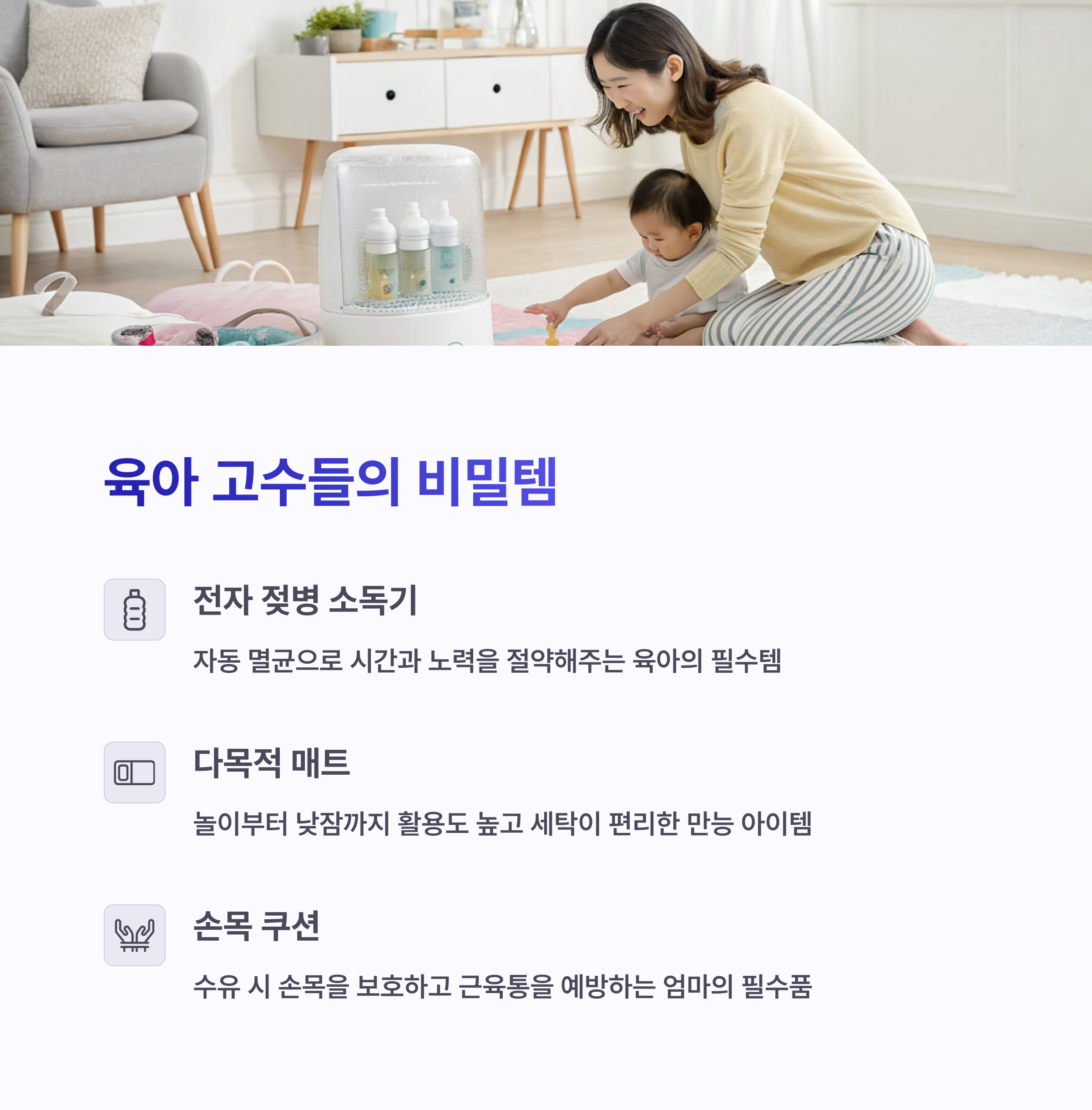 육아라는 것이 쉽지 않다는 걸 누구보다 잘 아는 부모님들. 그들의 삶을 확연히 편리하게 만들어주는 생활 비밀템들을 소개합니다!