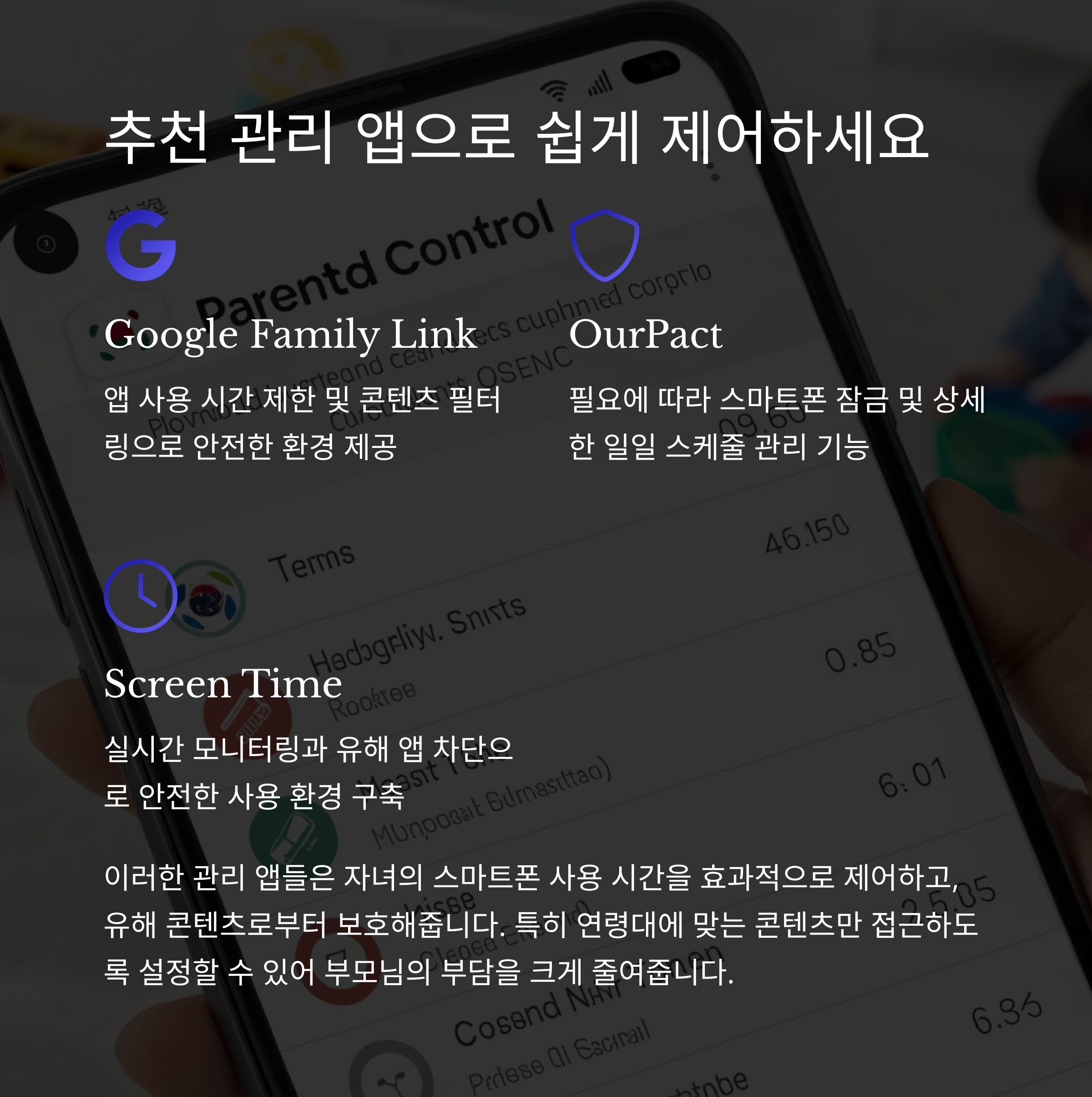 스마트폰 관리 앱은 자녀의 기기 사용 시간, 특정 앱 제한 등을 설정할 수 있는 강력한 도구입니다. 다음은 추천 앱 3가지입니다:
