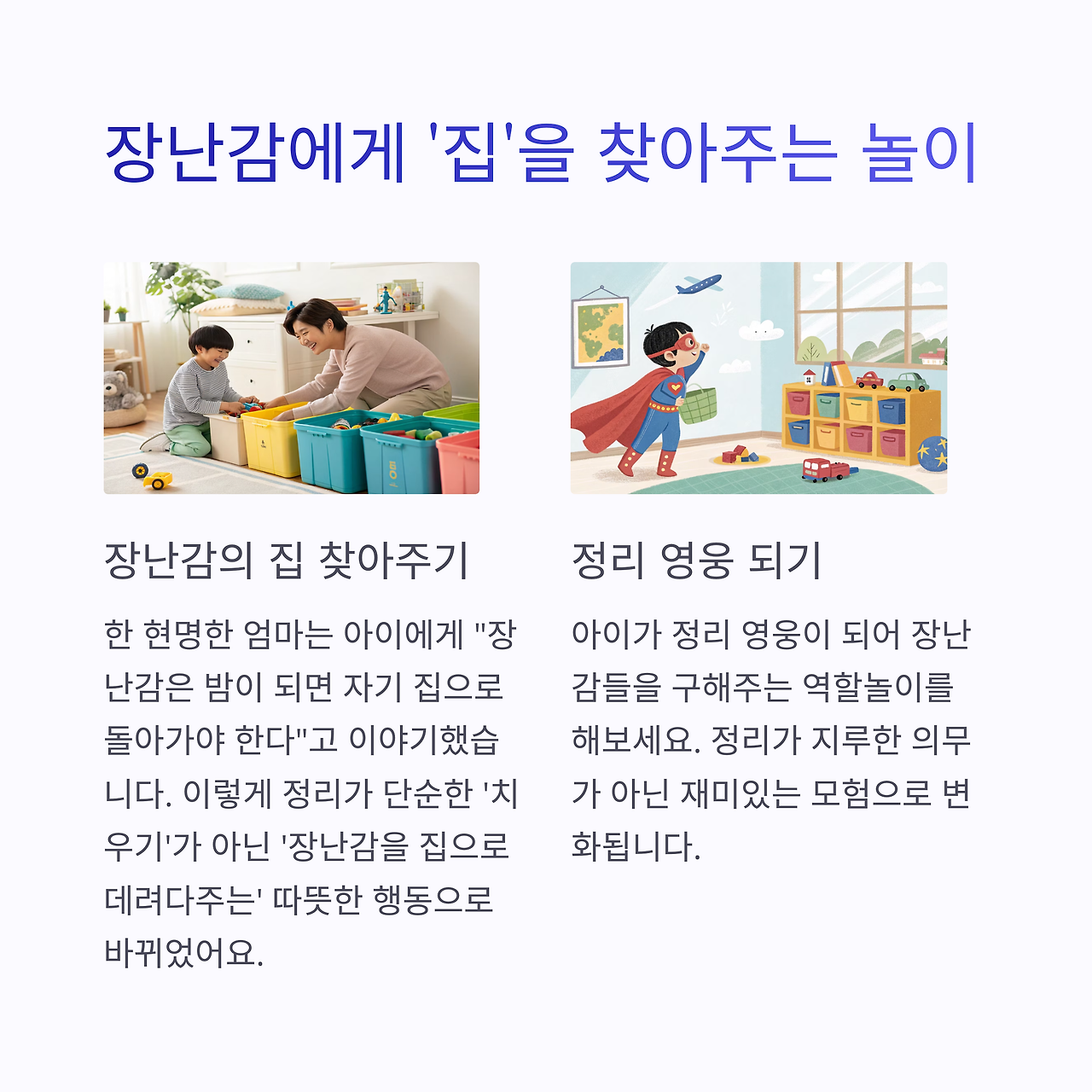 놀랍게도, 아이는 장난감을 집에 데려가는 놀이처럼 생각하며 정리를 시작했습니다. 심리적 관점을 변화시키는 한마디가 정리 습관 형성의 시작이 된 겁니다.