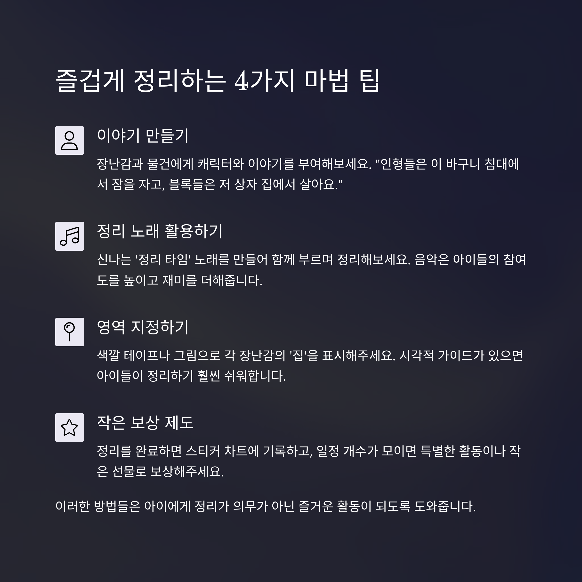 이제 자녀와 함께 간단히 적용해볼 수 있는 정리 교육 팁을 알려드릴게요: