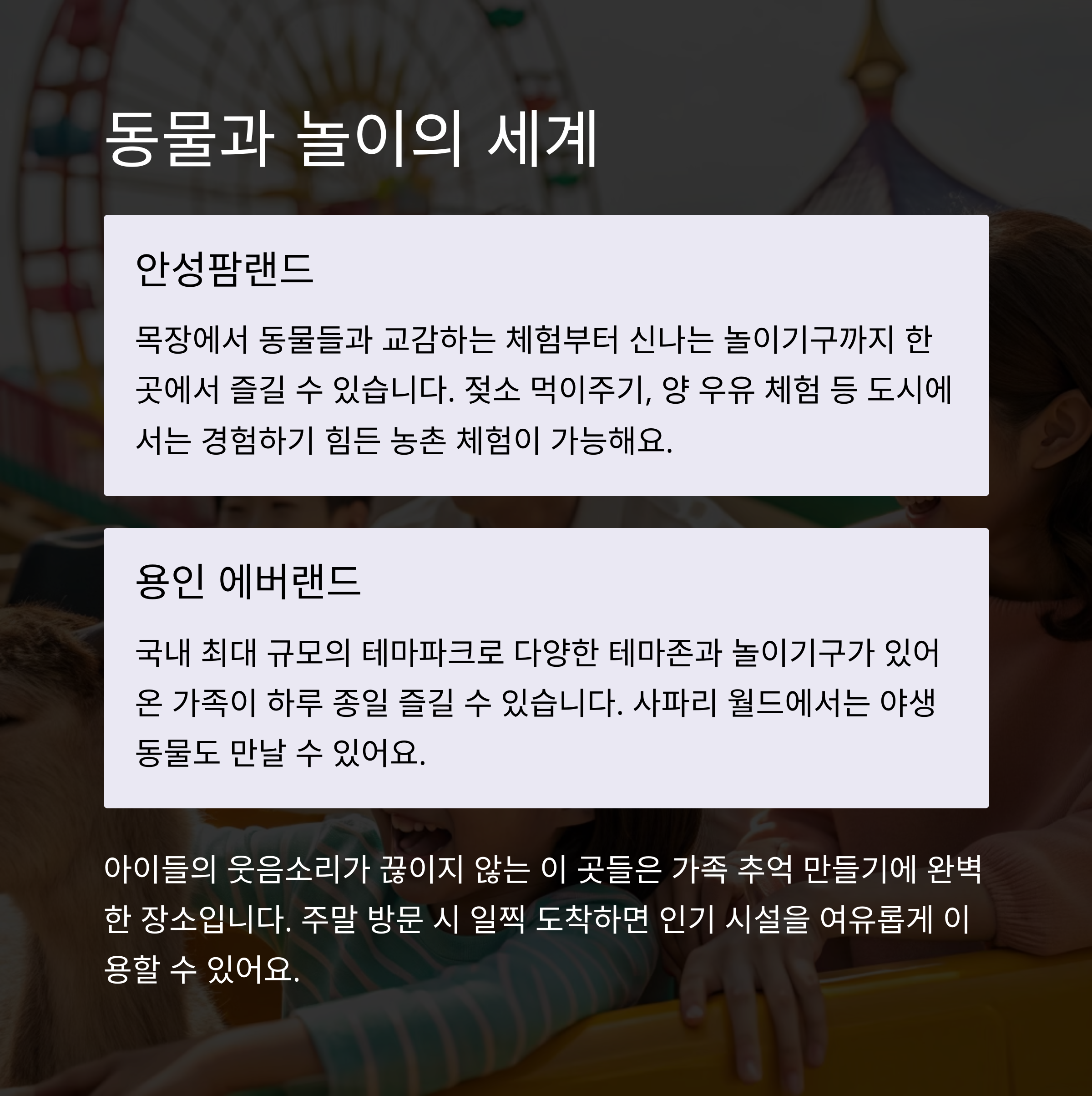 다양한 연령대의 아이들에게 적합하며, 동심과 자연을 모두 느낄 수 있는 이 두 곳은 주말 나들이 장소로 강력 추천드립니다.