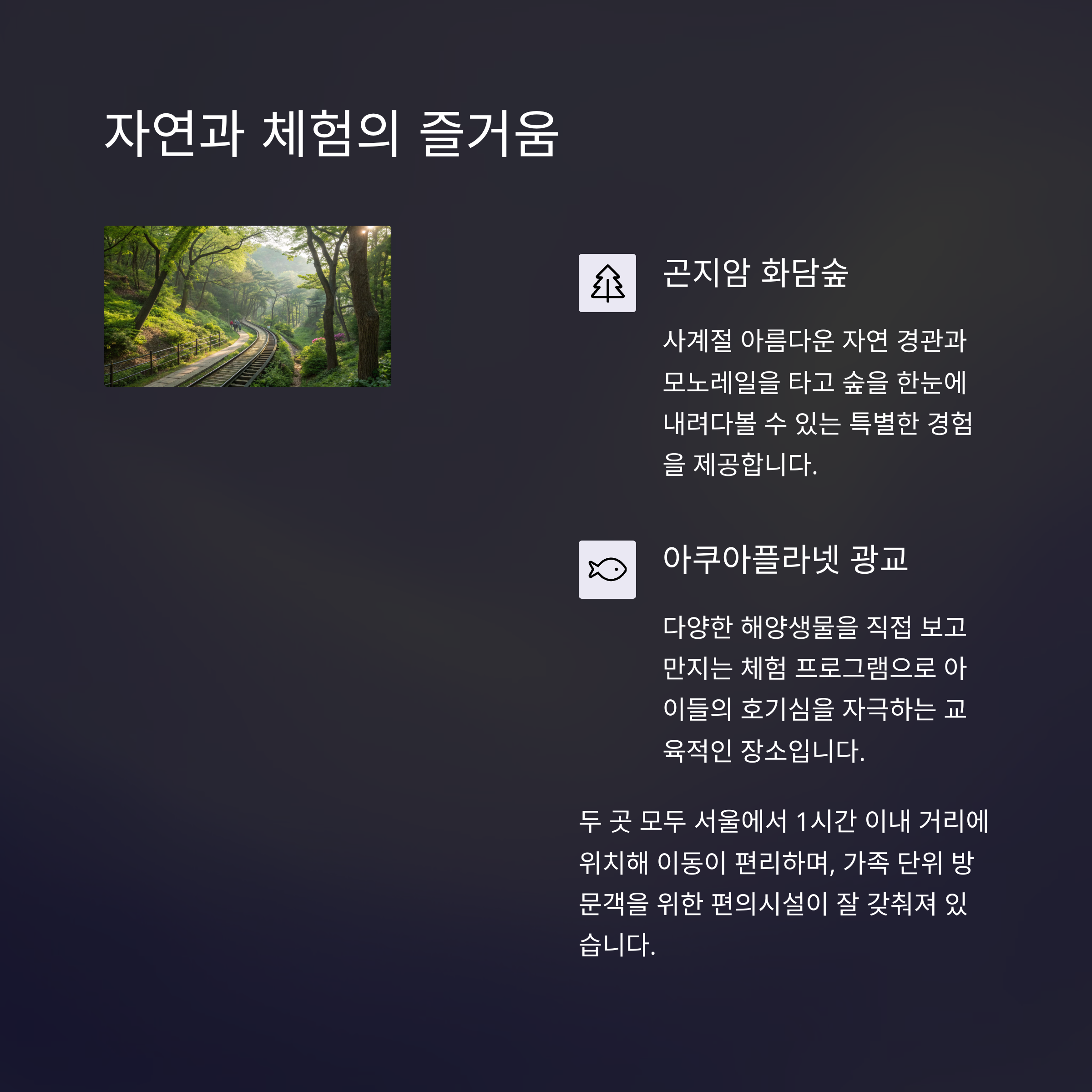 | 곤지암 화담숲 | 1시간 | 계절 자연 풍경 | 산책화 |