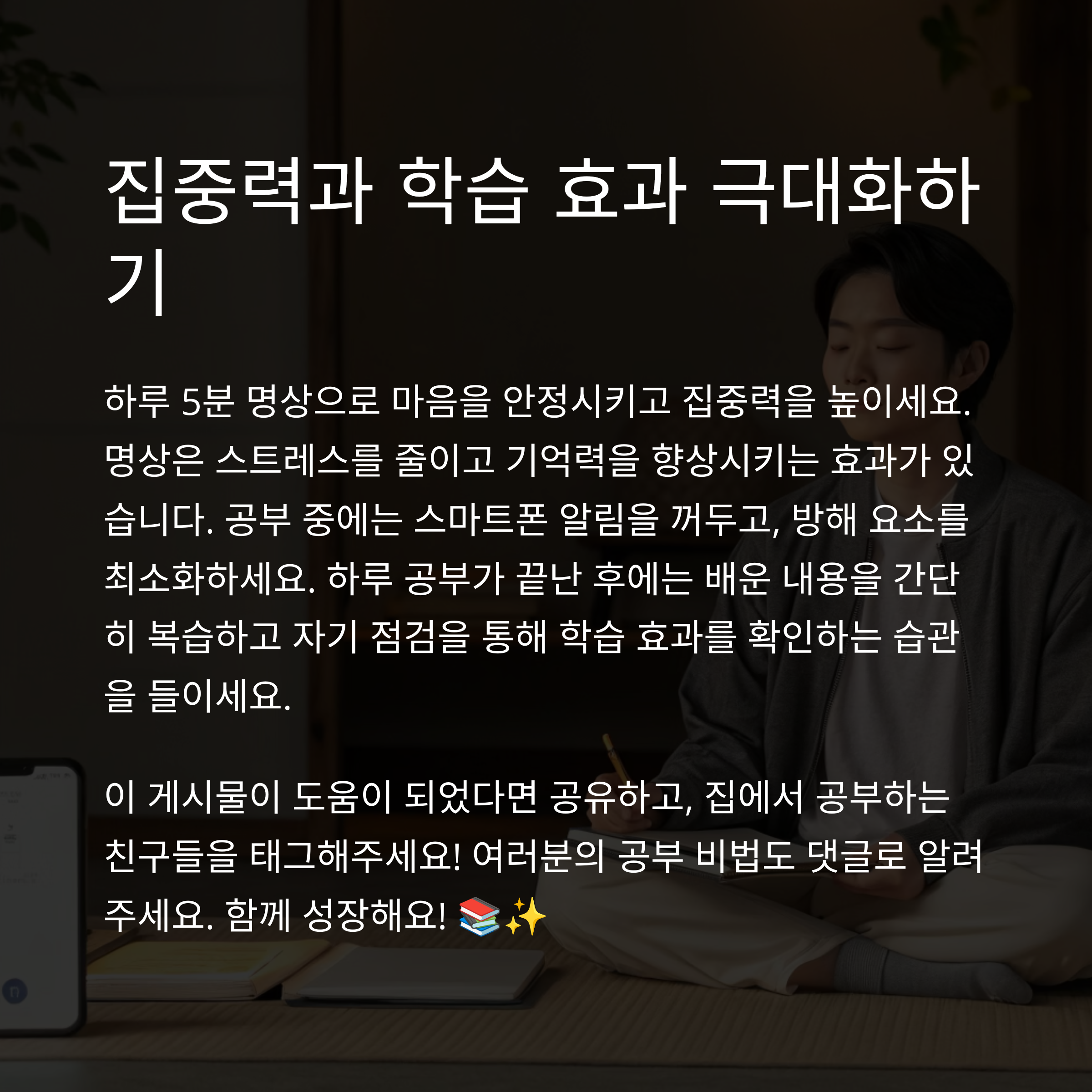 오늘 소개한 방법들을 단계적으로 실천하면 집에서도 충분히 효과적으로 공부할 수 있습니다. 여러분의 공부 성공을 응원합니다! 💪