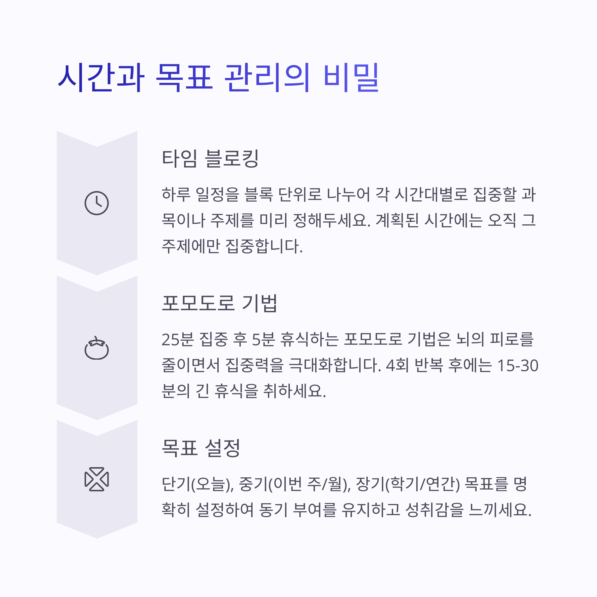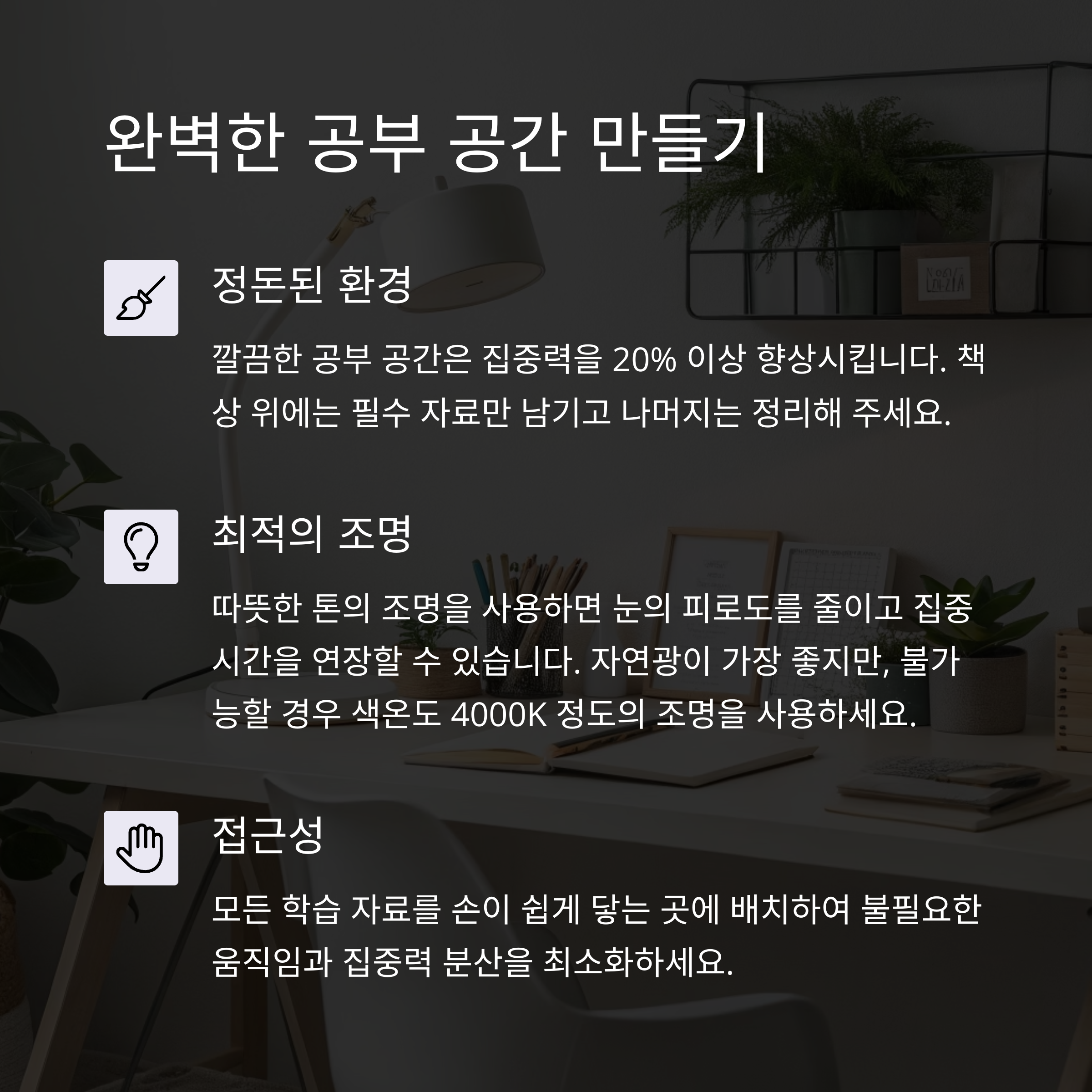 요약: 성공적인 공부의 비결은 꾸준함과 올바른 방식입니다. 오늘 다룰 내용은 공부 공간 개선, 시간 관리, 동기 부여 유지 등 단계별로 실용적이고 구체적인 팁들입니다.