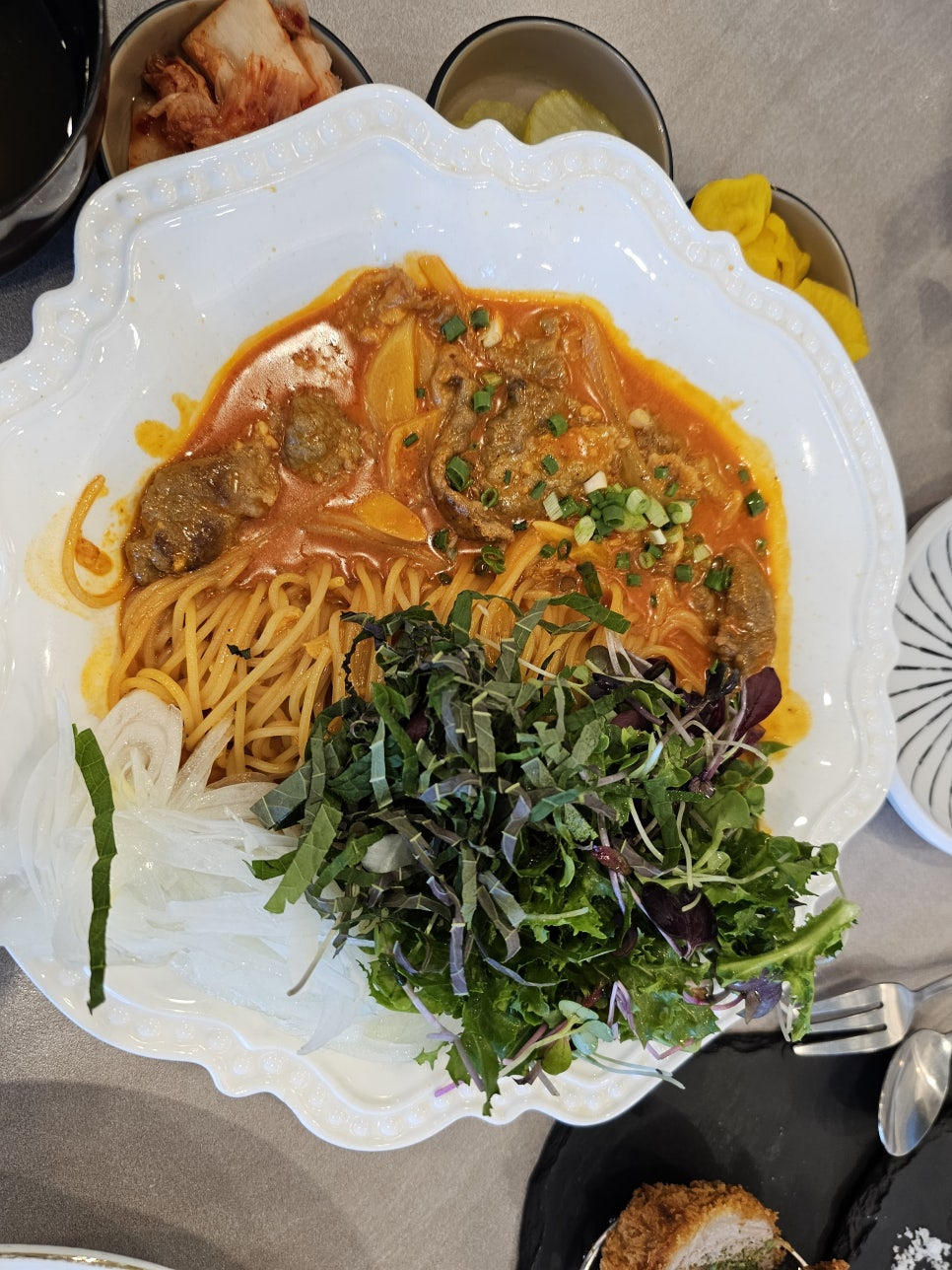 🍝 부드러운 갈비가 푹 익혀져 있어 면과 함께 먹으면 깊은 감칠맛을 느낄 수 있었어요. 일반적인 크림 파스타나 토마토 파스타와는 다르게 한국적인 매콤함이 가미되어 있어서 더 특별한 맛이 났답니다! 파스타 위에 올라간 깻잎과 각종 채소들이 신선하고, 조화롭게 어우러졌어요.