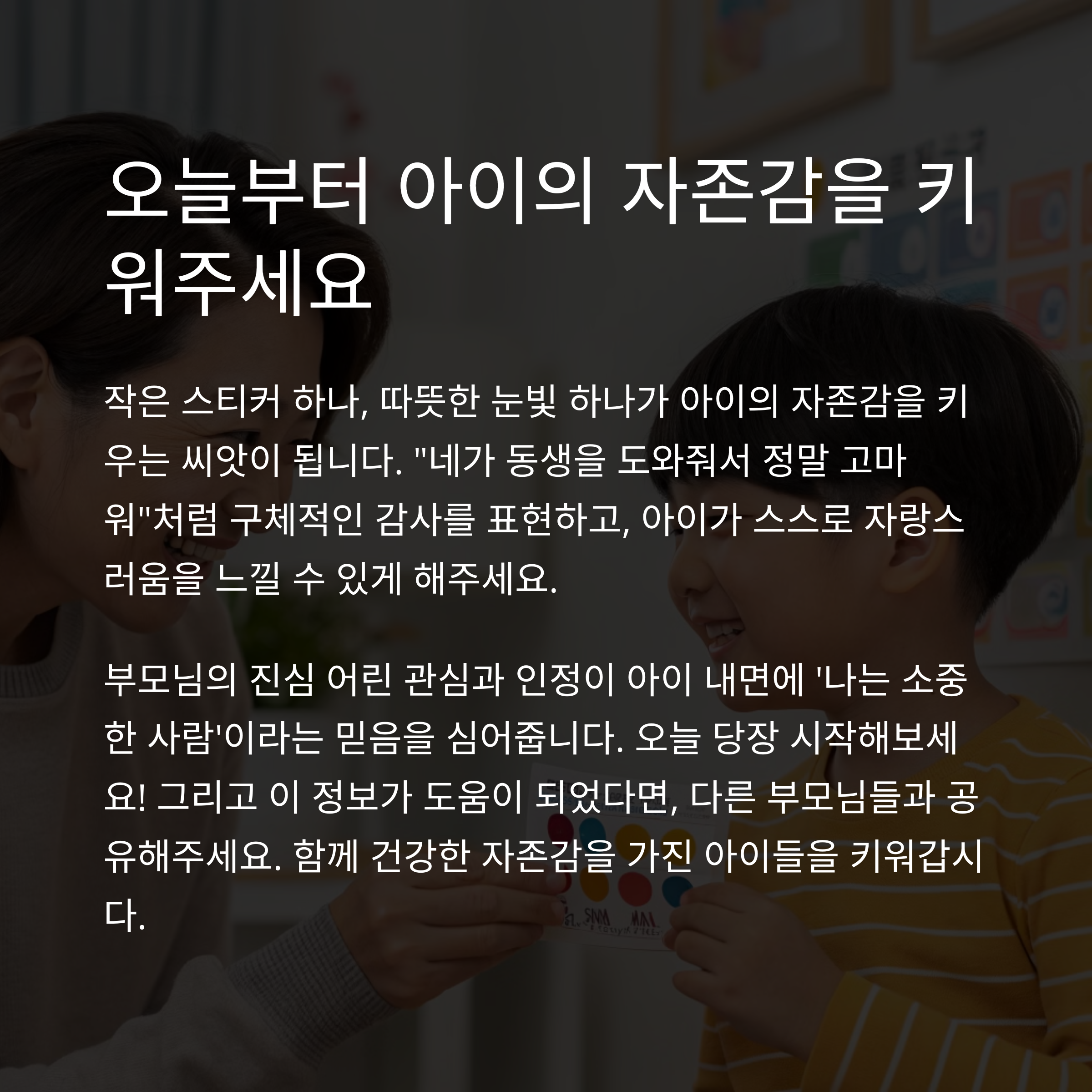 자존감이 높아진 아이는 도전 앞에서 두려워하지 않고, 더 따뜻한 아이로 자라납니다.
