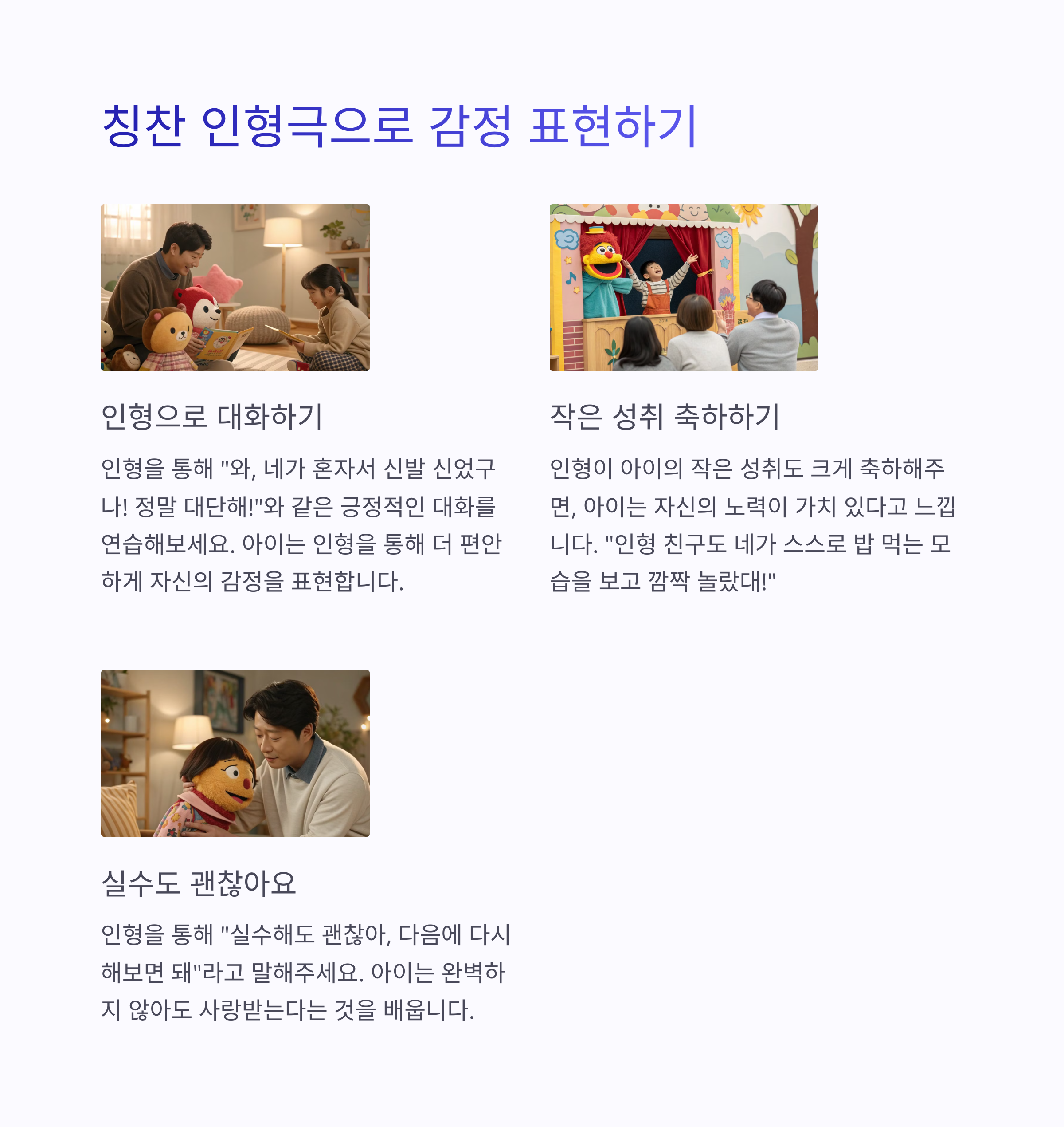 - 역할 바꾸기 인형극: 인형이 아이를 칭찬하고 고마워하는 역할