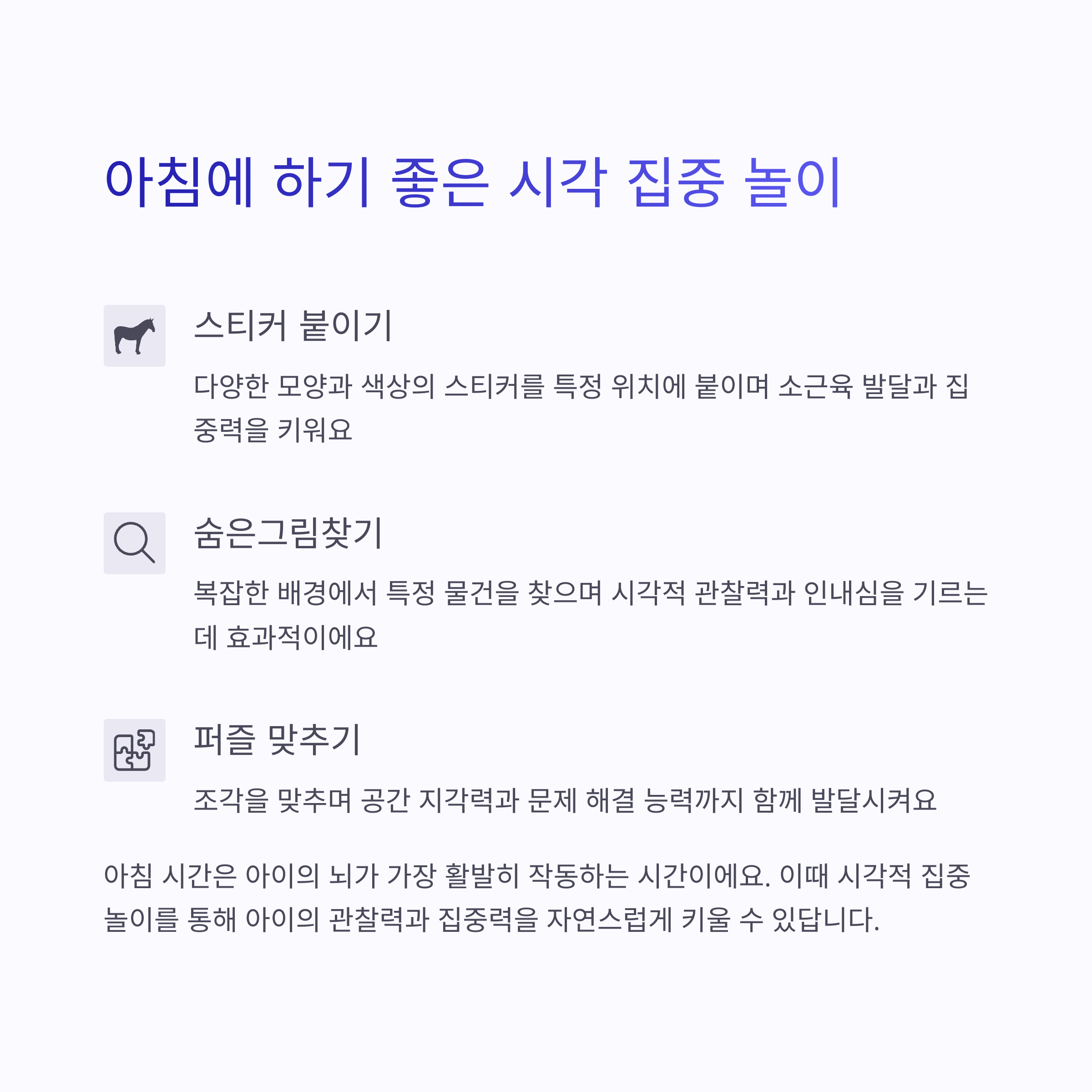 | 숨은그림 찾기 | 간단한 이미지 속에서 특정 그림을 찾으며 관찰력 강화 |