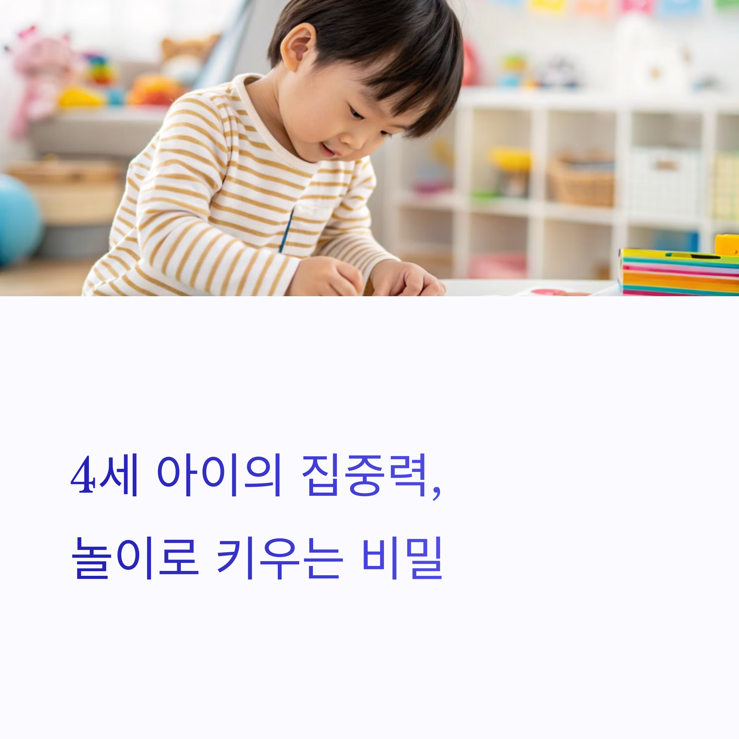 4세는 놀이를 통해 사고력, 언어력, 감정 조절력 등 다양한 인지 능력이 확장되는 시기예요. 이때 잠깐 집중해서 몰입하는 힘을 길러주는 것이 향후 학습 태도, 사회성에도 긍정적인 영향을 미칩니다. 꼭 책상 앞에서 오래 앉아 있지 않아도, 짧고 반복적인 ‘놀이 시간’만으로 충분히 훈련될 수 있어요.
