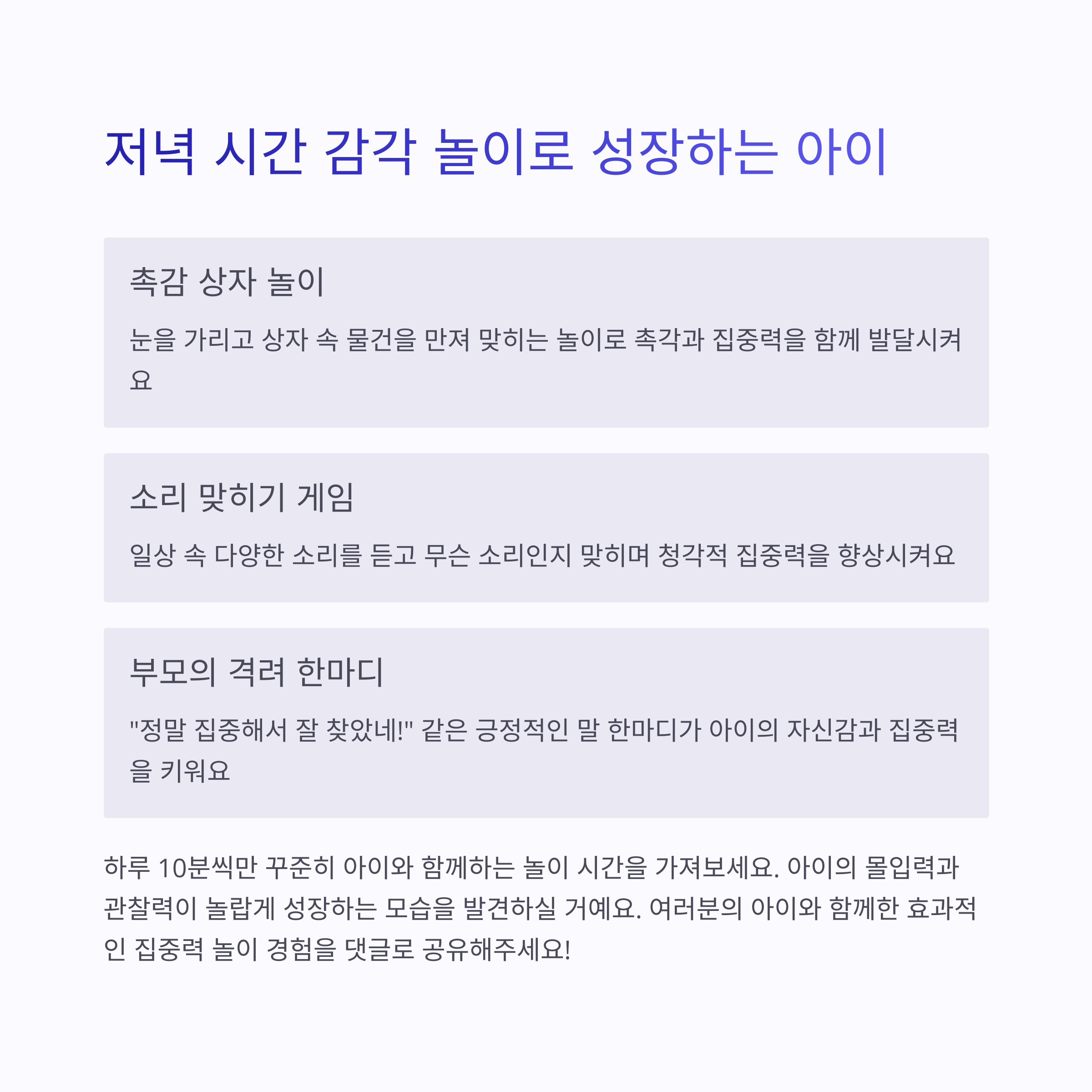 - 🔈 사운드 맞추기 – 눈을 감고 소리를 듣고 무엇인지 맞혀보는 놀이