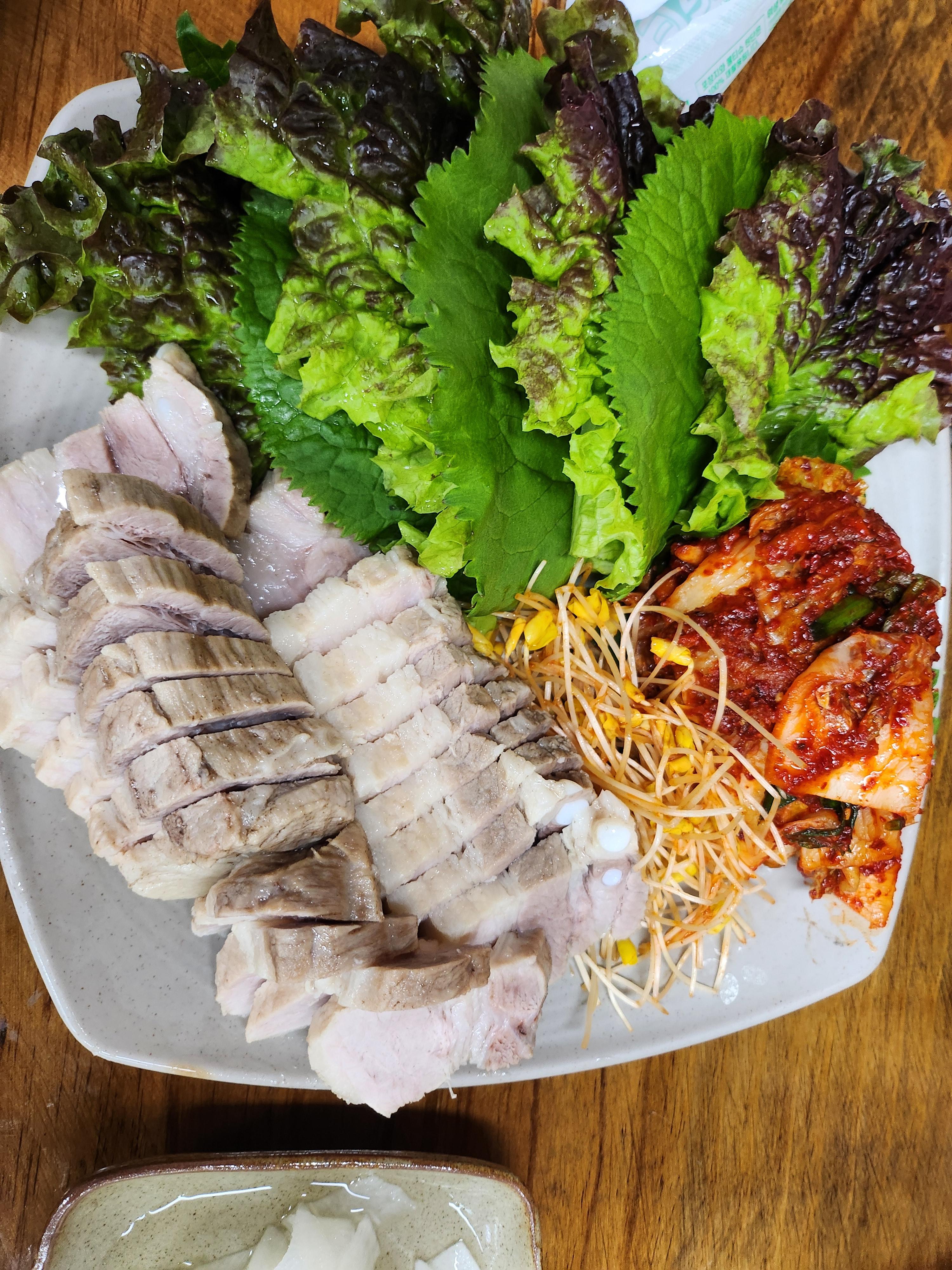 • 보쌈 고기 위에 배추잎, 무말랭이, 막장 올려 한입에 쏘옥!
